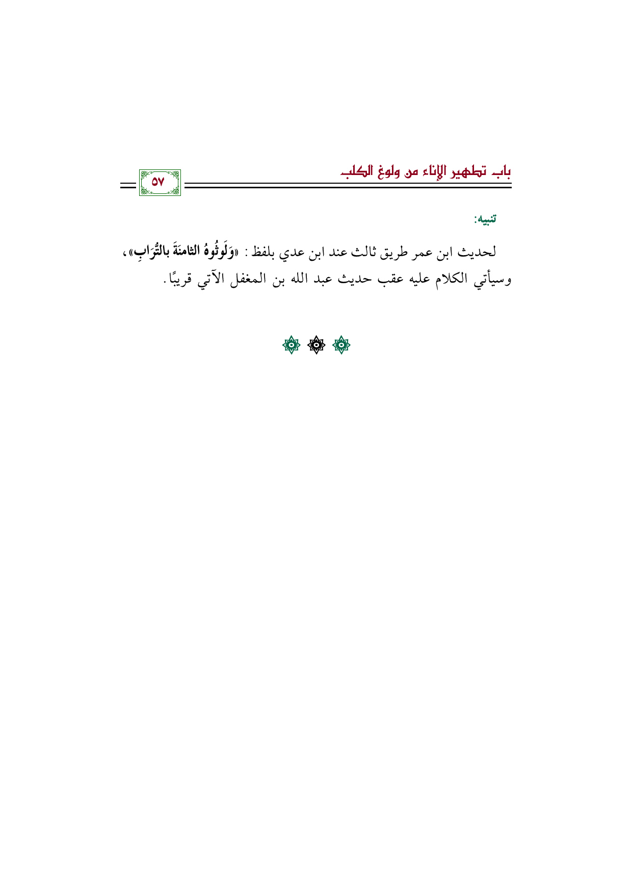 لحديث ابن عمر طريق ثالث عند ابن عدي بلفظ: ((وَلَوثُوهُ الثامنَةَ بالتُّرَابِ))، وسيأتي الكلام عليه عقب حديث عبد الله بن المغفل الآتي قريبًا.