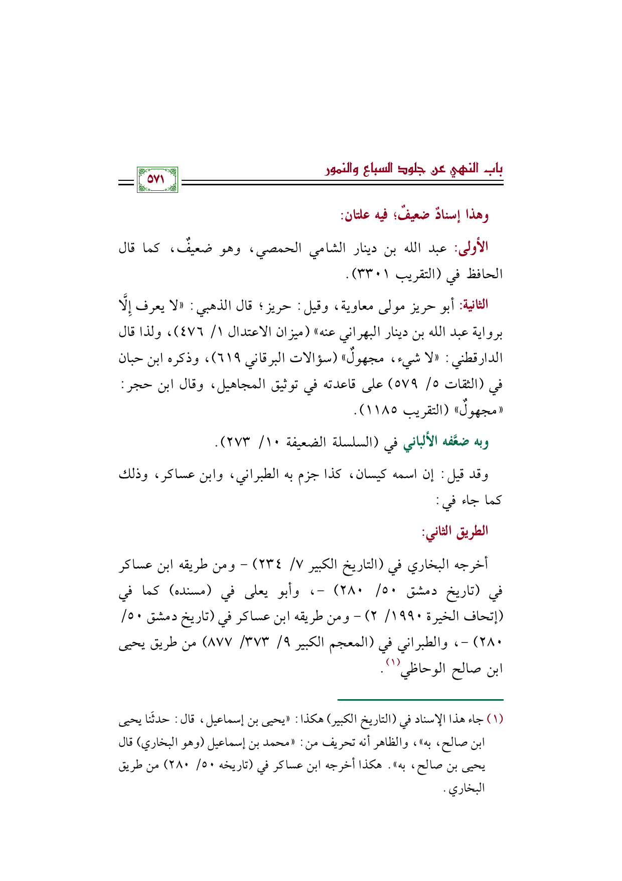الثانية: أبو حريز مولى معاوية، وقيل: حريز؛ قال الذهبي: ((لا يعرف إِلَّا برواية عبد الله بن دينار البهراني عنه)) (ميزان الاعتدال ١/ ٤٧٦)، ولذا قال الدارقطني: ((لا شيء، مجهولٌ)) (سؤالات البرقاني ٦١٩)، وذكره ابن حبان في (الثقات ٥/ ٥٧٩) على قاعدته في توثيق المجاهيل، وقال ابن حجر: ((مجهولٌ)) (التقريب ١١٨٥).