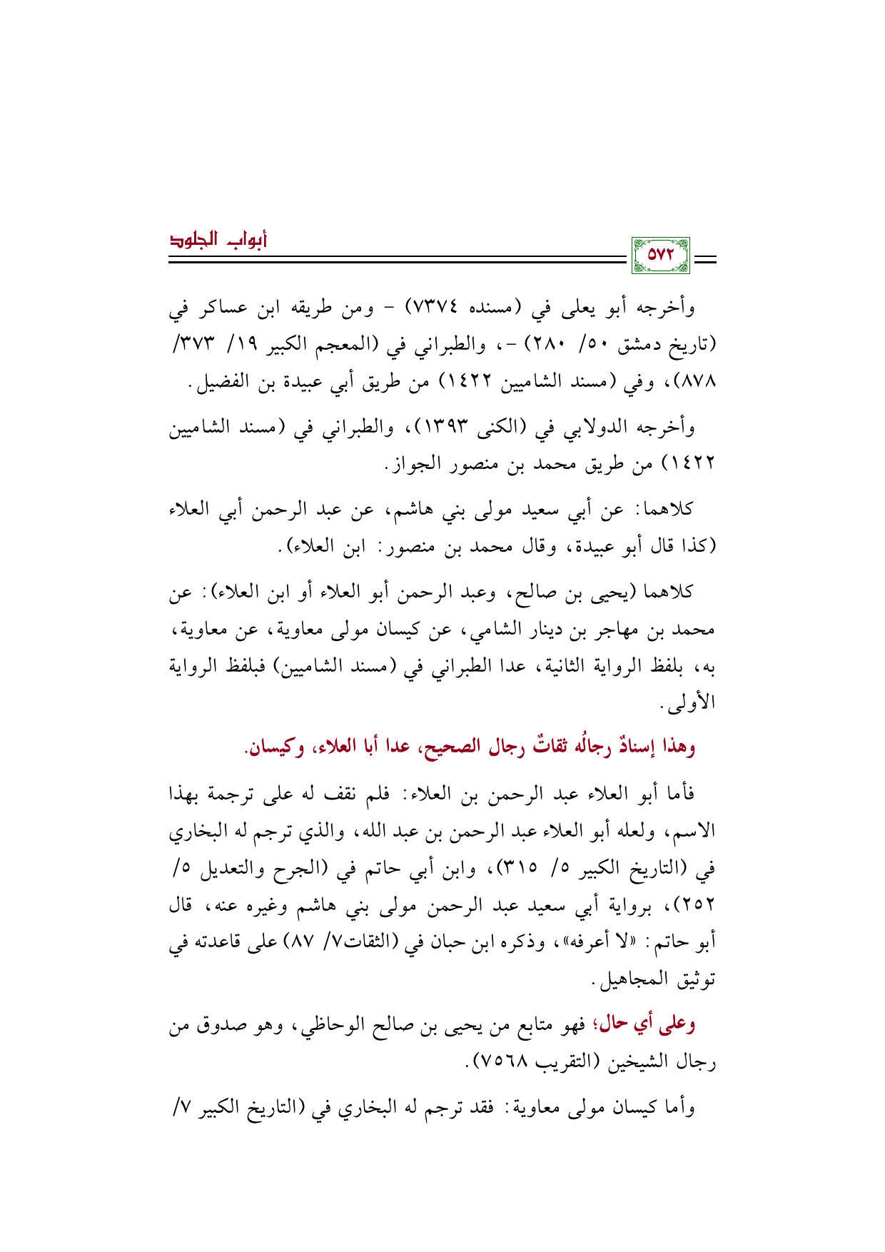 فأما أبو العلاء عبد الرحمن بن العلاء: فلم نقف له على ترجمة بهذا الاسم، ولعله أبو العلاء عبد الرحمن بن عبد الله، والذي ترجم له البخاري في (التاريخ الكبير ٥/ ٣١٥)، وابن أبي حاتم في (الجرح والتعديل ٥/ ٢٥٢)، برواية أبي سعيد عبد الرحمن مولى بني هاشم وغيره عنه، قال أبو حاتم: ((لا أعرفه))، وذكره ابن حبان في (الثقات ٧/ ٨٧) على قاعدته في توثيق المجاهيل.