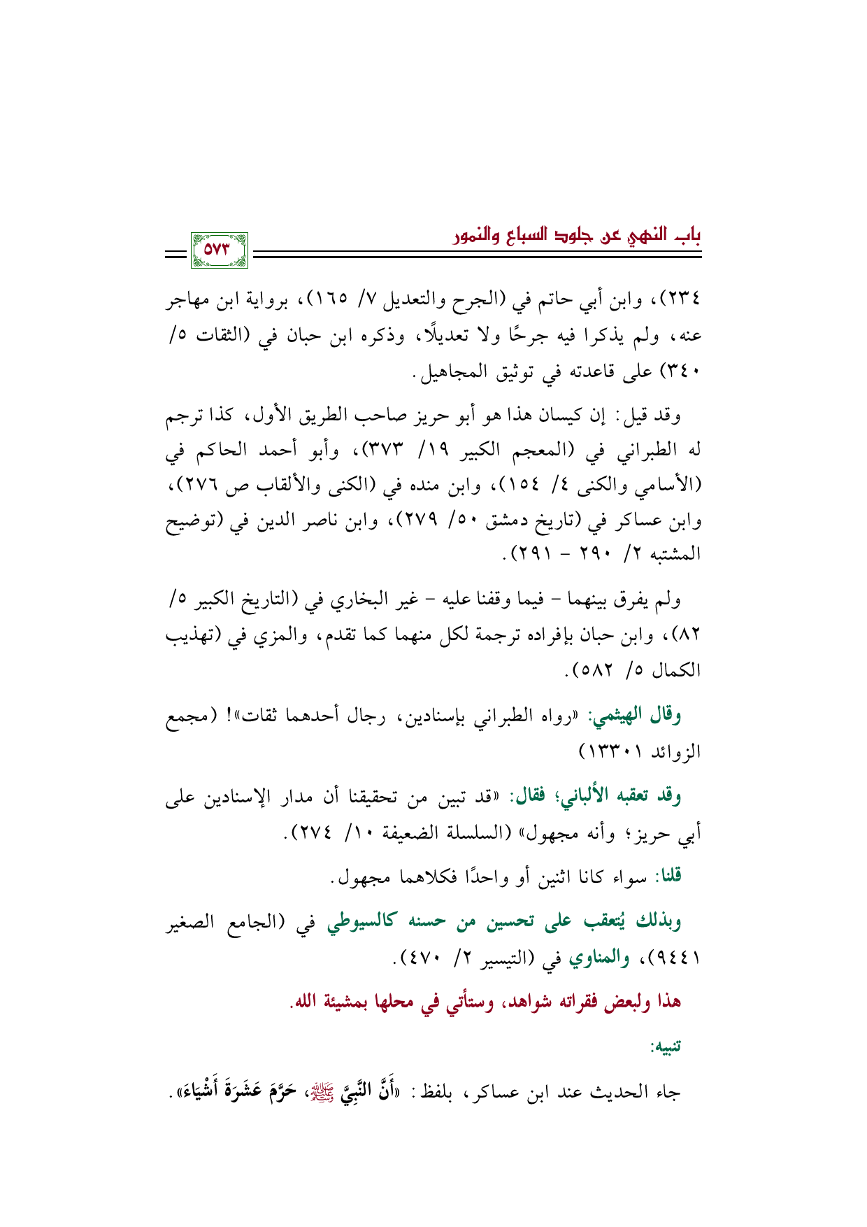 وقد تعقبه الألباني؛ فقال: ((قد تبين من تحقيقنا أن مدار الإسنادين على أبي حريز؛ وأنه مجهول)) (السلسلة الضعيفة ١٠/ ٢٧٤).
