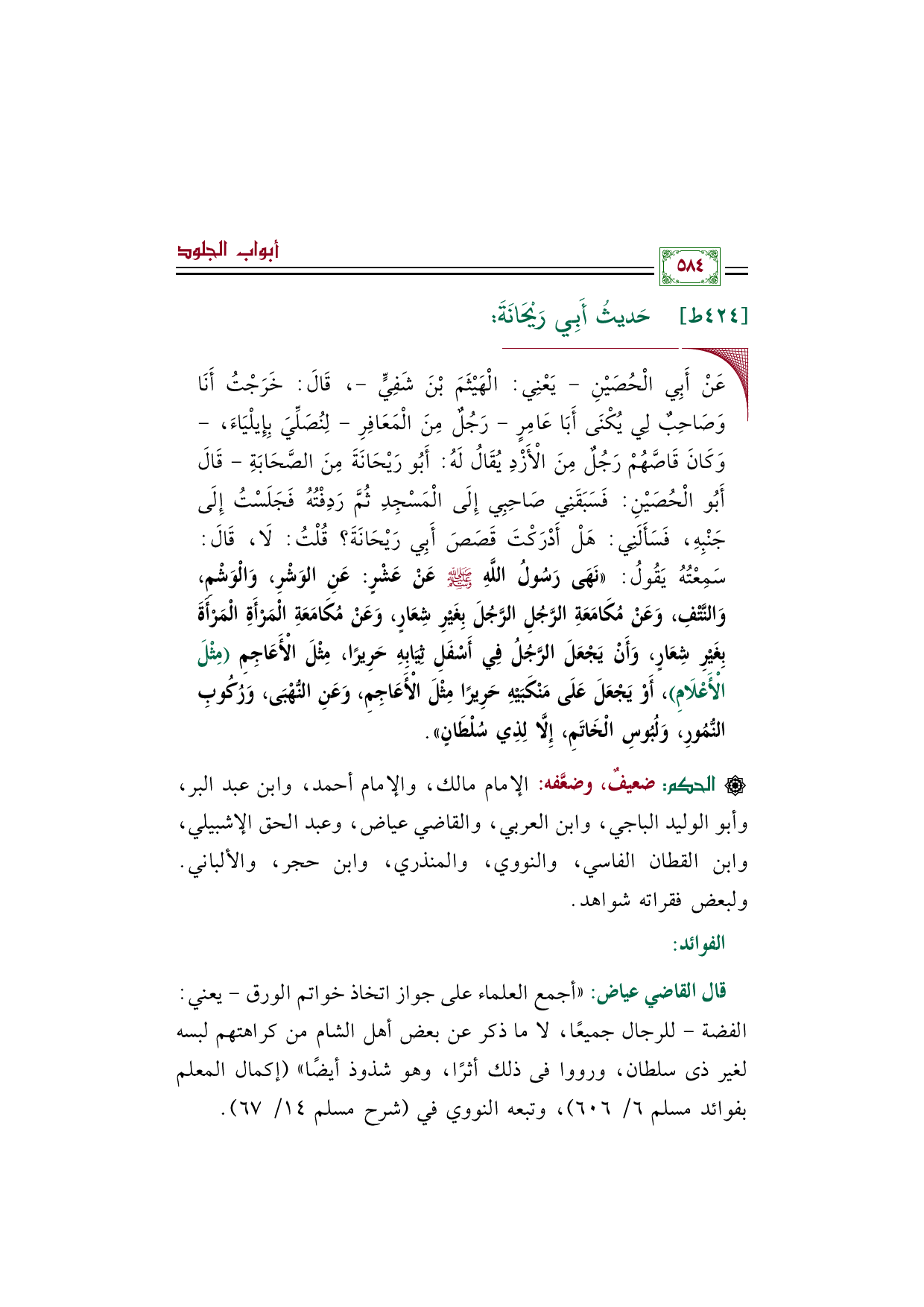 قال القاضي عياض: ((أجمع العلماء على جواز اتخاذ خواتم الورق -يعني: الفضة- للرجال جميعًا، لا ما ذكر عن بعض أهل الشام من كراهتهم لبسه لغير ذى سلطان، ورووا فى ذلك أثرًا، وهو شذوذ أيضًا)) (إكمال المعلم بفوائد مسلم ٦/ ٦٠٦)، وتبعه النووي في (شرح مسلم ١٤/ ٦٧).