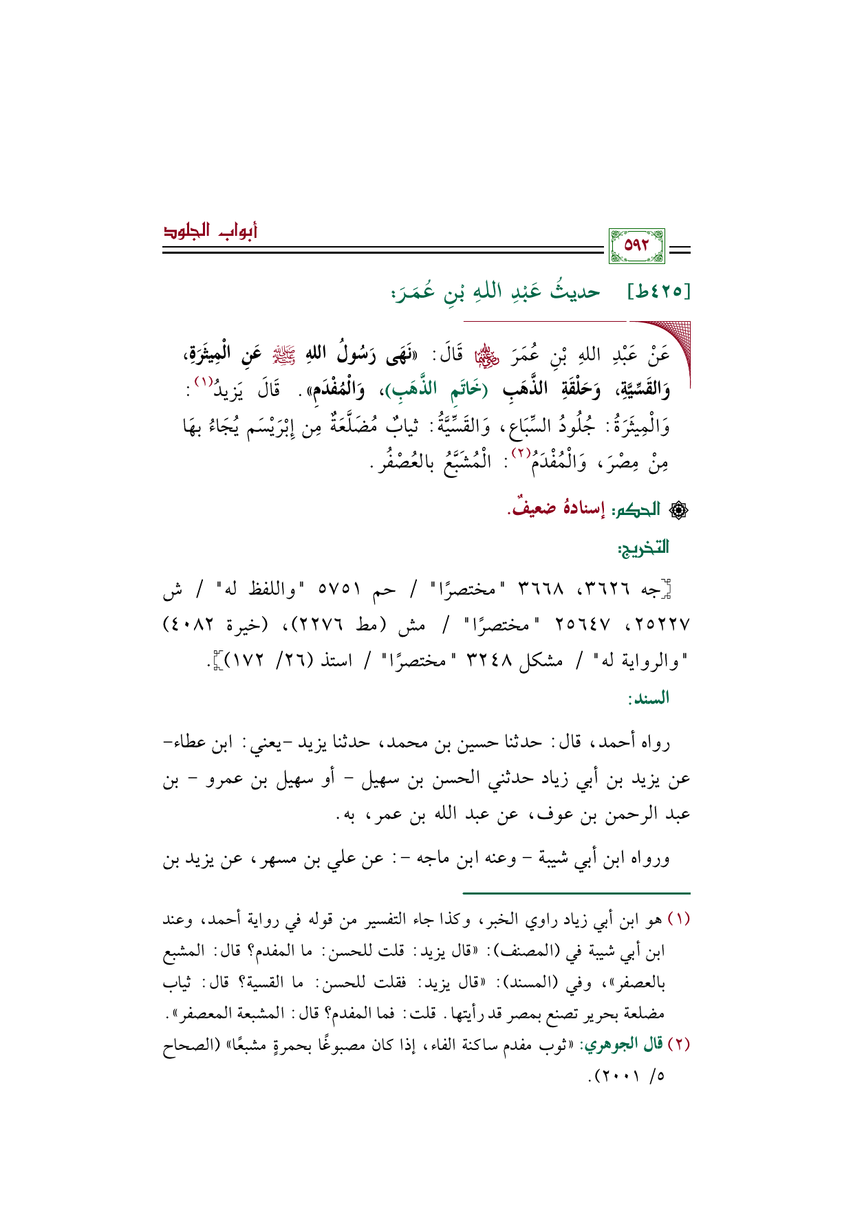 (¬١) هو ابن أبي زياد راوي الخبر، وكذا جاء التفسير من قوله في رواية أحمد، وعند ابن أبي شيبة في (المصنف): ((قال يزيد: قلت للحسن: ما المفدم؟ قال: المشبع بالعصفر))، وفي (المسند): ((قال يزيد: فقلت للحسن: ما القسية؟ قال: ثياب مضلعة بحرير تصنع بمصر قد رأيتها. قلت: فما المفدم؟ قال: المشبعة المعصفر)).