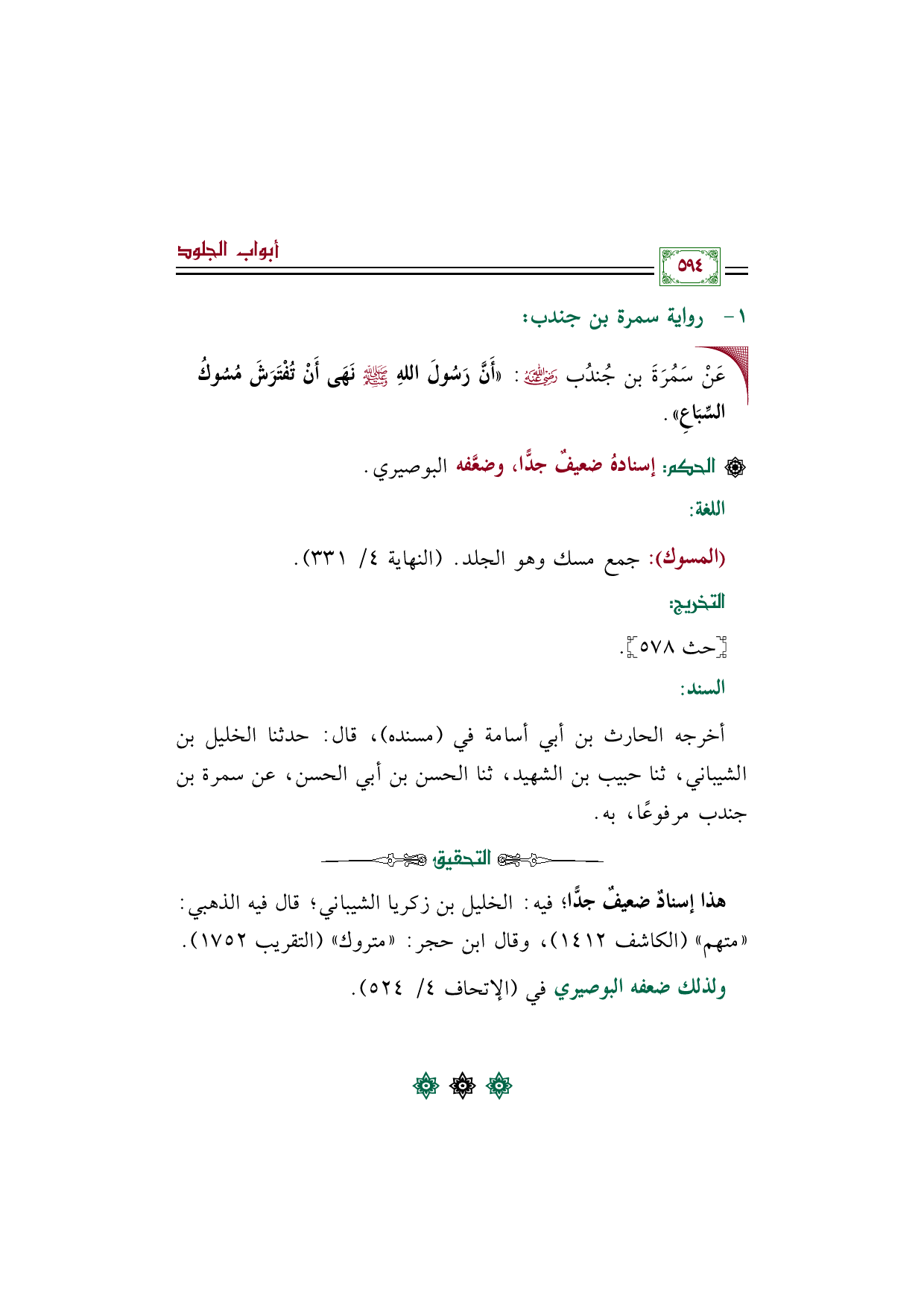 ◼ عَنْ سَمُرَةَ بن جُندُب رضي الله عنه: ((أَنَّ رَسُولَ اللهِ صلى الله عليه وسلم نَهَى أَنْ تُفْتَرَشَ مُسُوكُ السِّبَاعِ)).