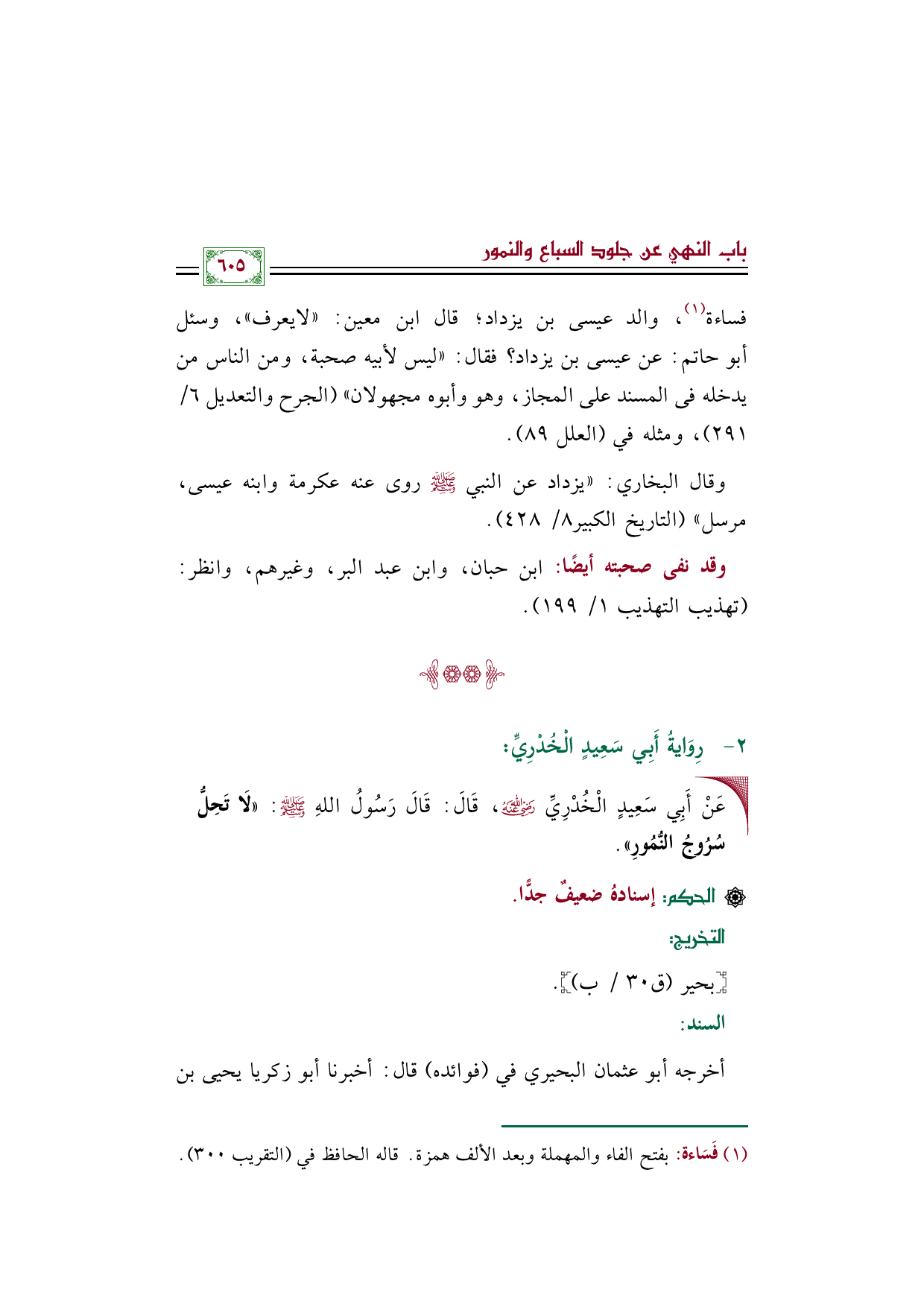 فساءة (¬١)، والد عيسى بن يزداد؛ قال ابن معين: ((لايعرف))، وسئل أبو حاتم: عن عيسى بن يزداد؟ فقال: ((ليس لأبيه صحبة، ومن الناس من يدخله فى المسند على المجاز، وهو وأبوه مجهولان)) (الجرح والتعديل ٦/ ٢٩١)، ومثله في (العلل ٨٩).