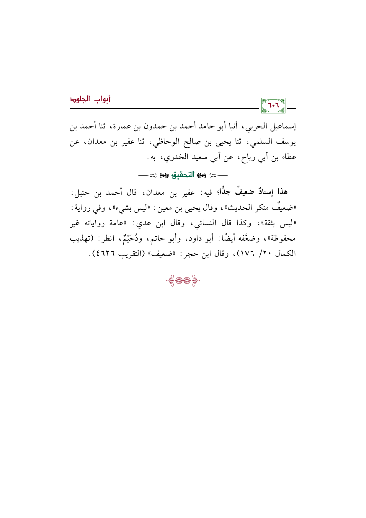 إسماعيل الحربي، أنبا أبو حامد أحمد بن حمدون بن عمارة، ثنا أحمد بن يوسف السلمي، ثنا يحيى بن صالح الوحاظي، ثنا عفير بن معدان، عن عطاء بن أبي رباح، عن أبي سعيد الخدري، به.