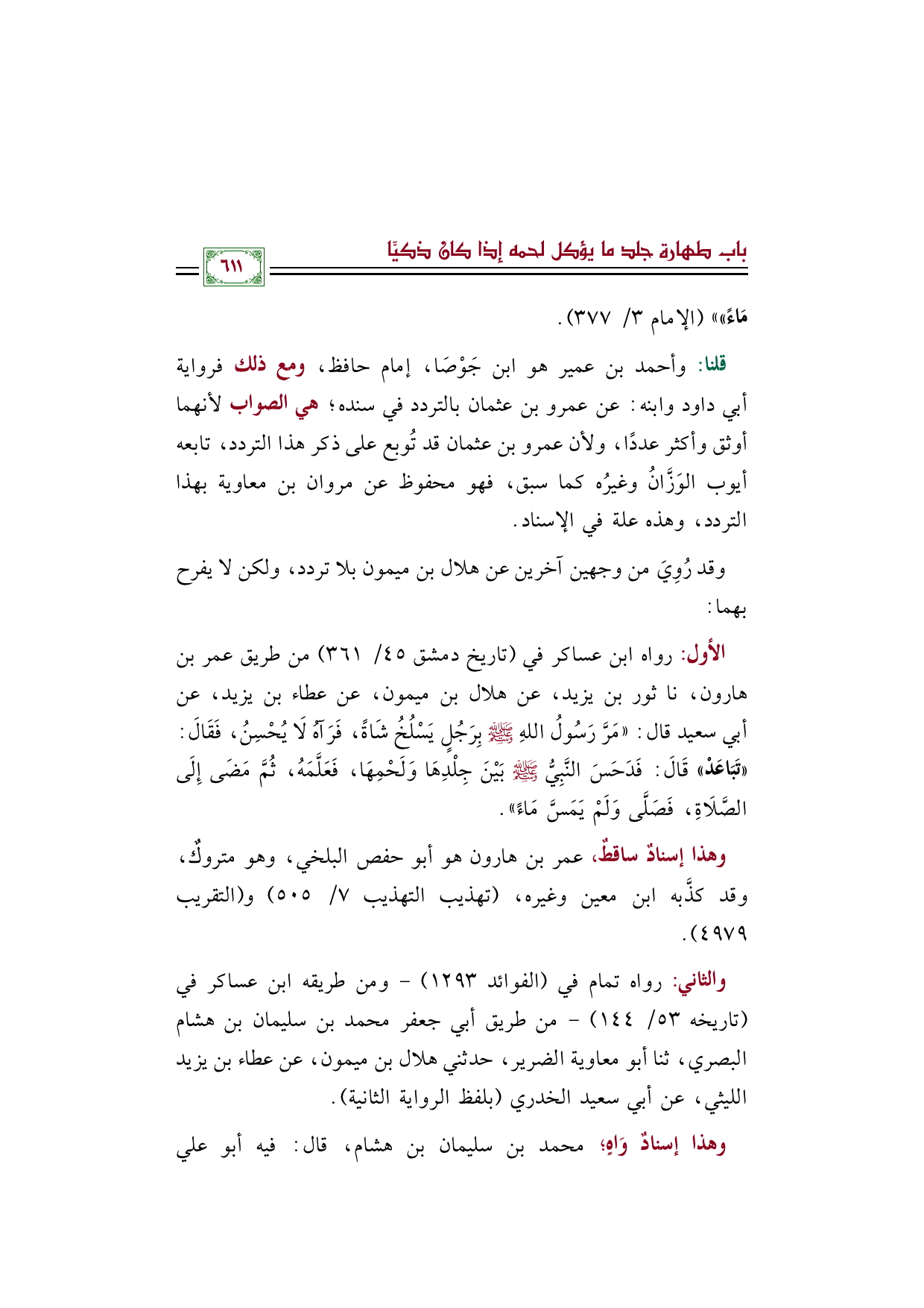 قلنا: وأحمد بن عمير هو ابن جَوْصَا، إمام حافظ، ومع ذلك فرواية أبي داود وابنه: عن عمرو بن عثمان بالتردد في سنده؛ هي الصواب لأنهما أوثق وأكثر عددًا، ولأن عمرو بن عثمان قد تُوبع على ذكر هذا التردد، تابعه أيوب الوَزَّانُ وغيرُه كما سبق، فهو محفوظ عن مروان بن معاوية بهذا التردد، وهذه علة في الإسناد.
