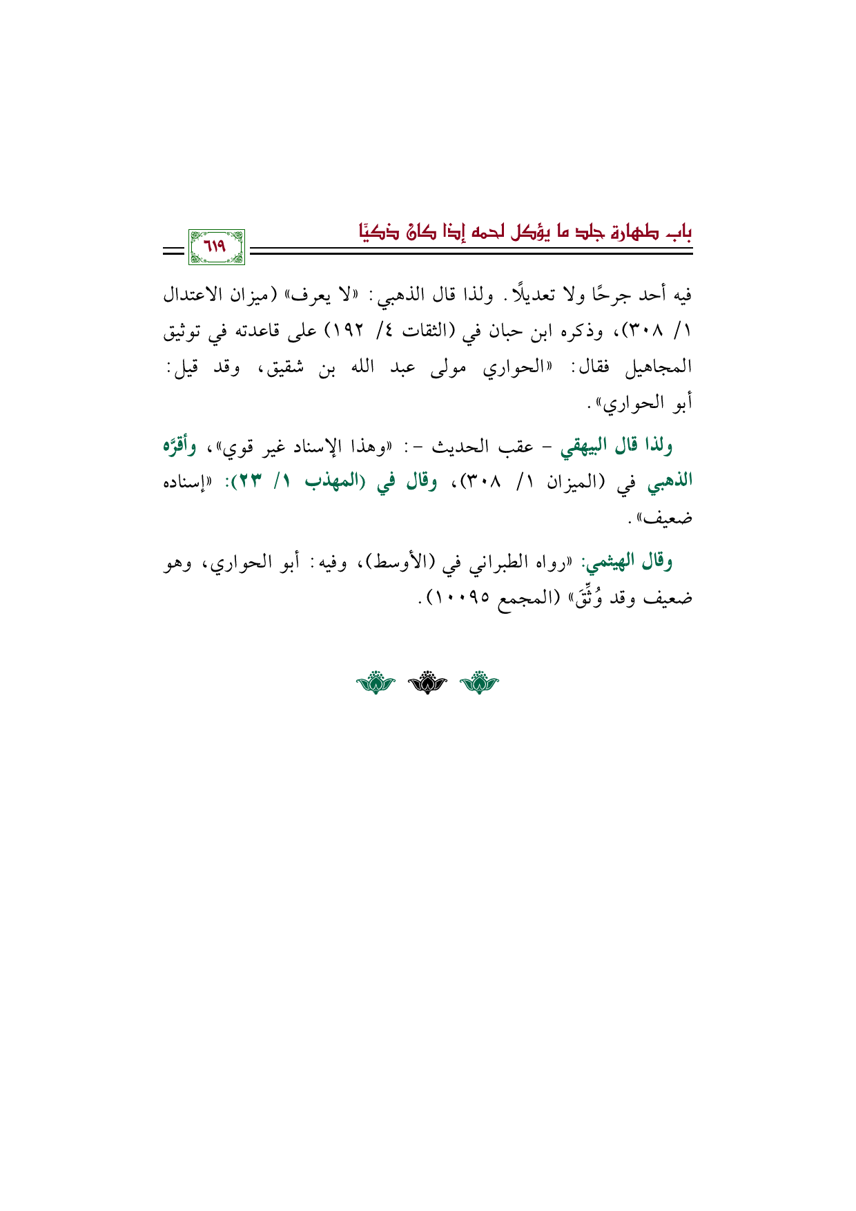 وقال الهيثمي: ((رواه الطبراني في (الأوسط)، وفيه: أبو الحواري، وهو ضعيف وقد وُثِّقَ)) (المجمع ١٠٠٩٥).