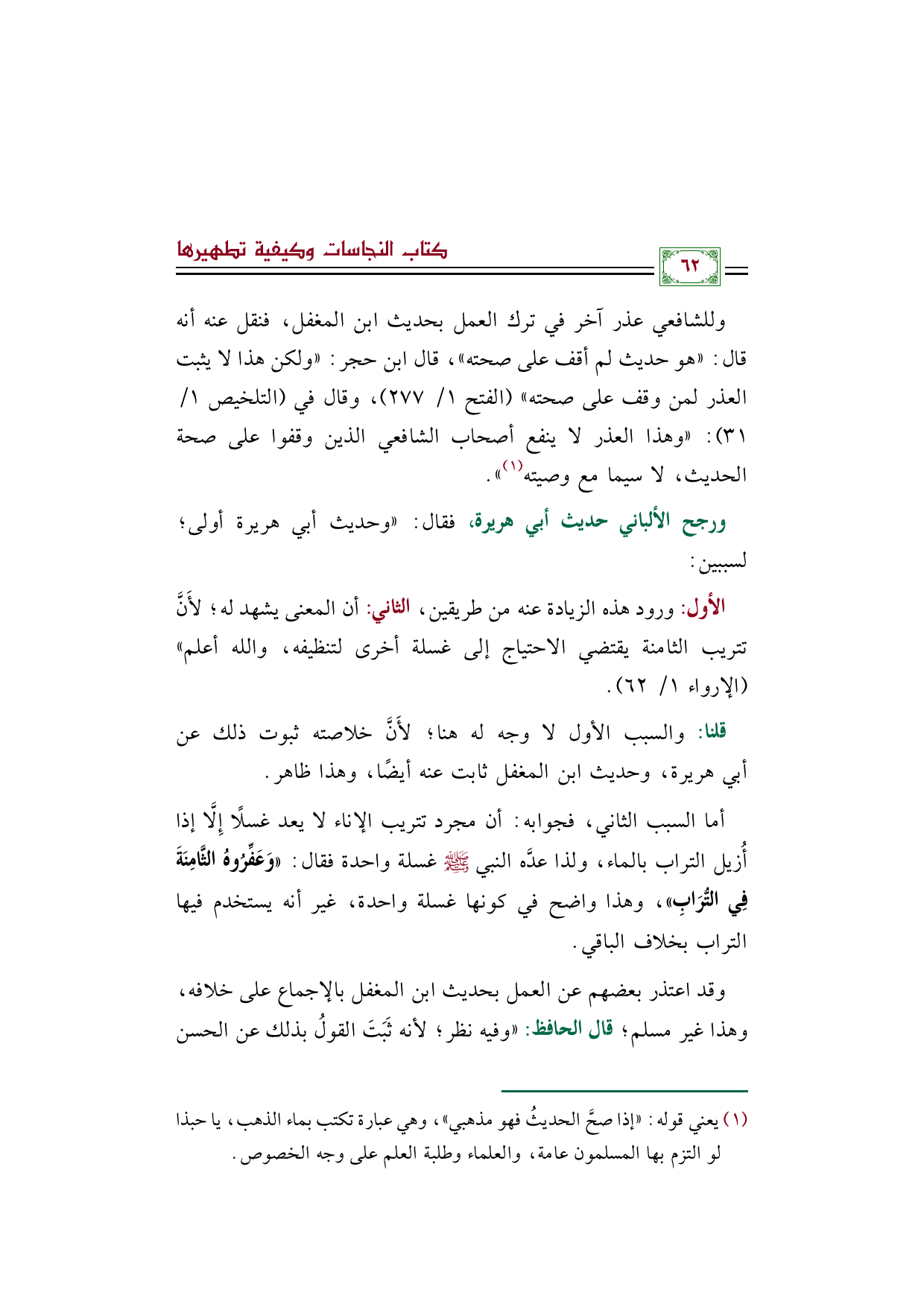 وللشافعي عذر آخر في ترك العمل بحديث ابن المغفل، فنقل عنه أنه قال: ((هو حديث لم أقف على صحته))، قال ابن حجر: ((ولكن هذا لا يثبت العذر لمن وقف على صحته)) (الفتح ١/ ٢٧٧)، وقال في (التلخيص ١/ ٣١): ((وهذا العذر لا ينفع أصحاب الشافعي الذين وقفوا على صحة الحديث، لا سيما مع وصيته (¬١))).