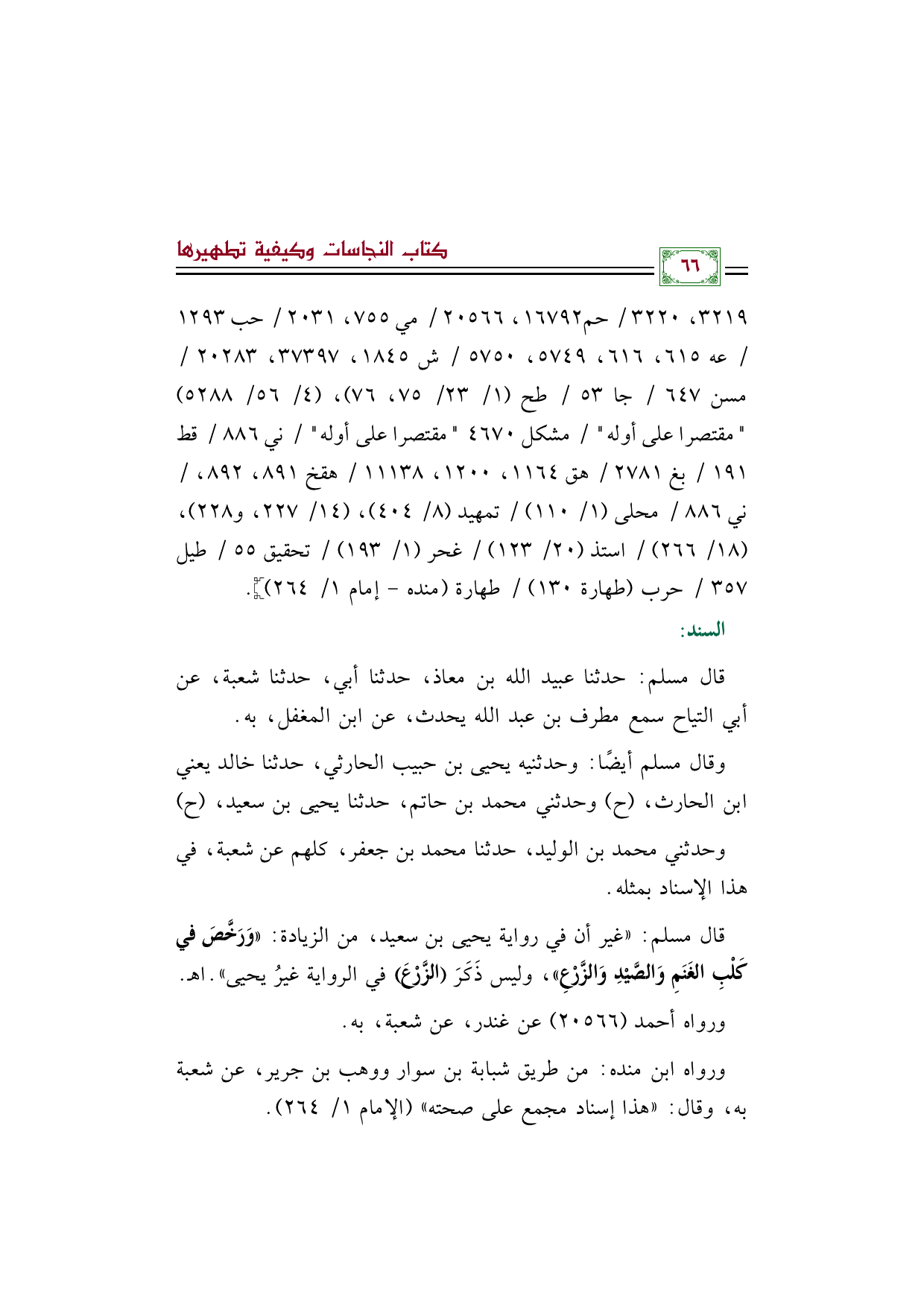 قال مسلم: ((غير أن في رواية يحيى بن سعيد، من الزيادة: ((وَرَخَّصَ في كَلْبِ الغَنَمِ وَالصَّيْدِ وَالزَّرْعِ))، وليس ذَكَرَ (الزَّرْعَ) في الرواية غيرُ يحيى)) ا. هـ.