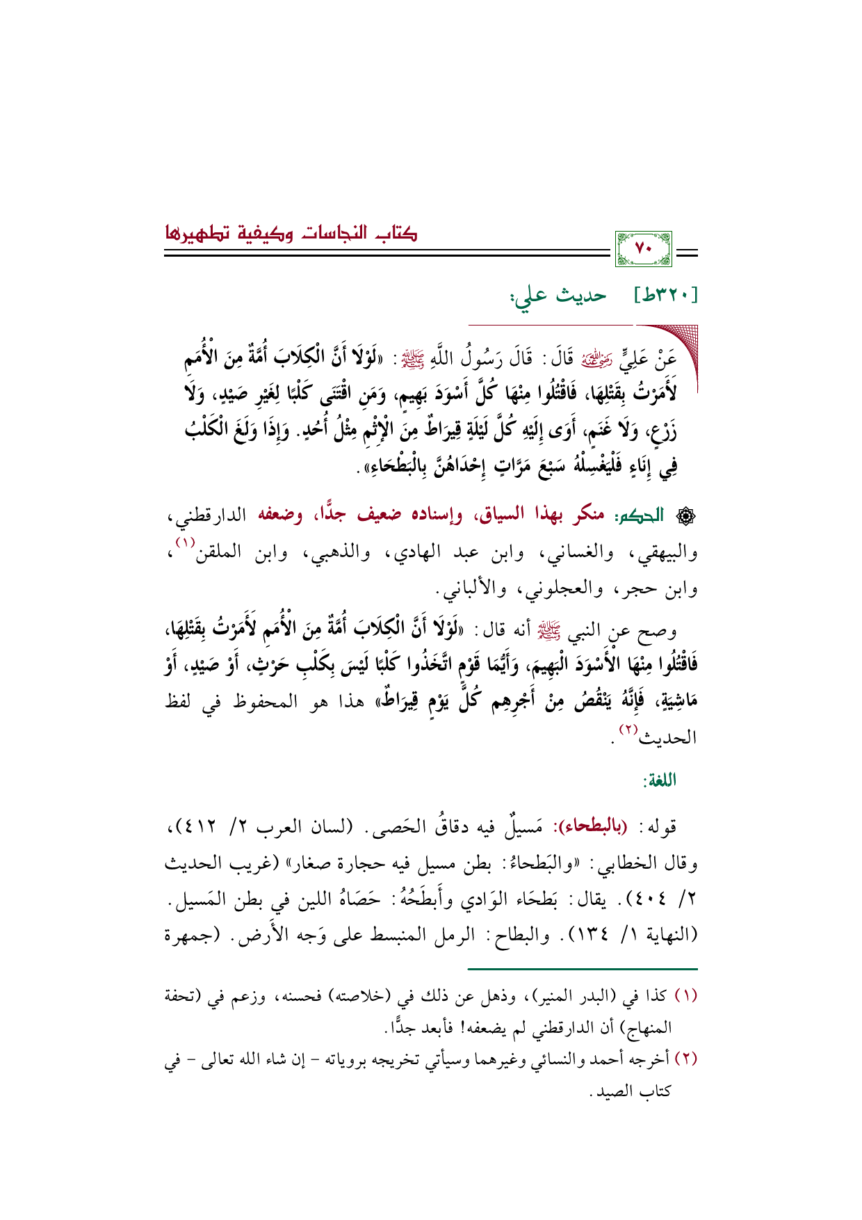 وصح عن النبي صلى الله عليه وسلم أنه قال: ((لَوْلَا أَنَّ الْكِلَابَ أُمَّةٌ مِنَ الْأُمَمِ لَأَمَرْتُ بِقَتْلِهَا، فَاقْتُلُوا مِنْهَا الْأَسْوَدَ الْبَهِيمَ، وَأَيُّمَا قَوْمٍ اتَّخَذُوا كَلْبًا لَيْسَ بِكَلْبِ حَرْثٍ، أَوْ صَيْدٍ، أَوْ مَاشِيَةٍ، فَإِنَّهُ يَنْقُصُ مِنْ أَجْرِهِم كُلَّ يَوْمٍ قِيرَاطٌ)) هذا هو المحفوظ في لفظ الحديث (¬٢).