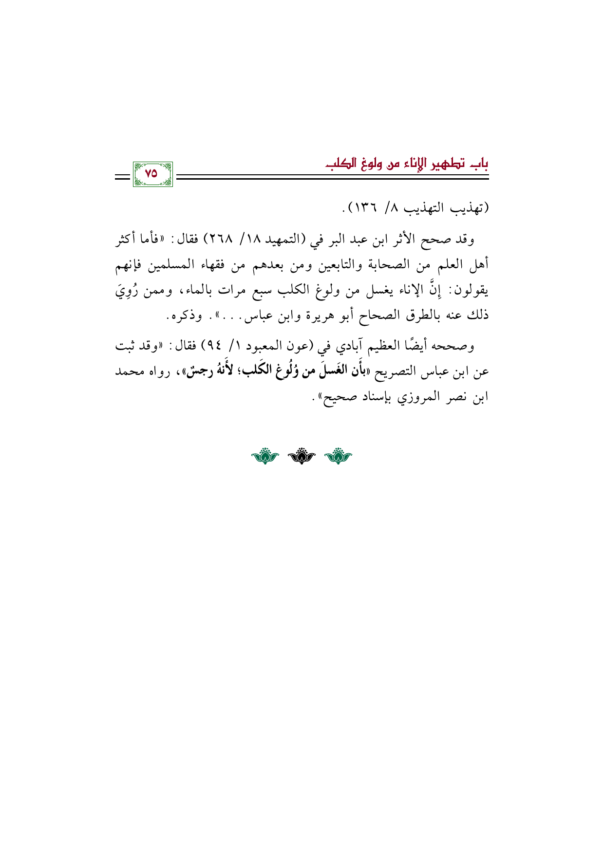 وصححه أيضًا العظيم آبادي في (عون المعبود ١/ ٩٤) فقال: ((وقد ثبت عن ابن عباس التصريح ((بأَن الغَسلَ من وُلُوغ الكَلب؛ لأَنهُ رجسٌ))، رواه محمد بن نصر المروزي بإسناد صحيح)).