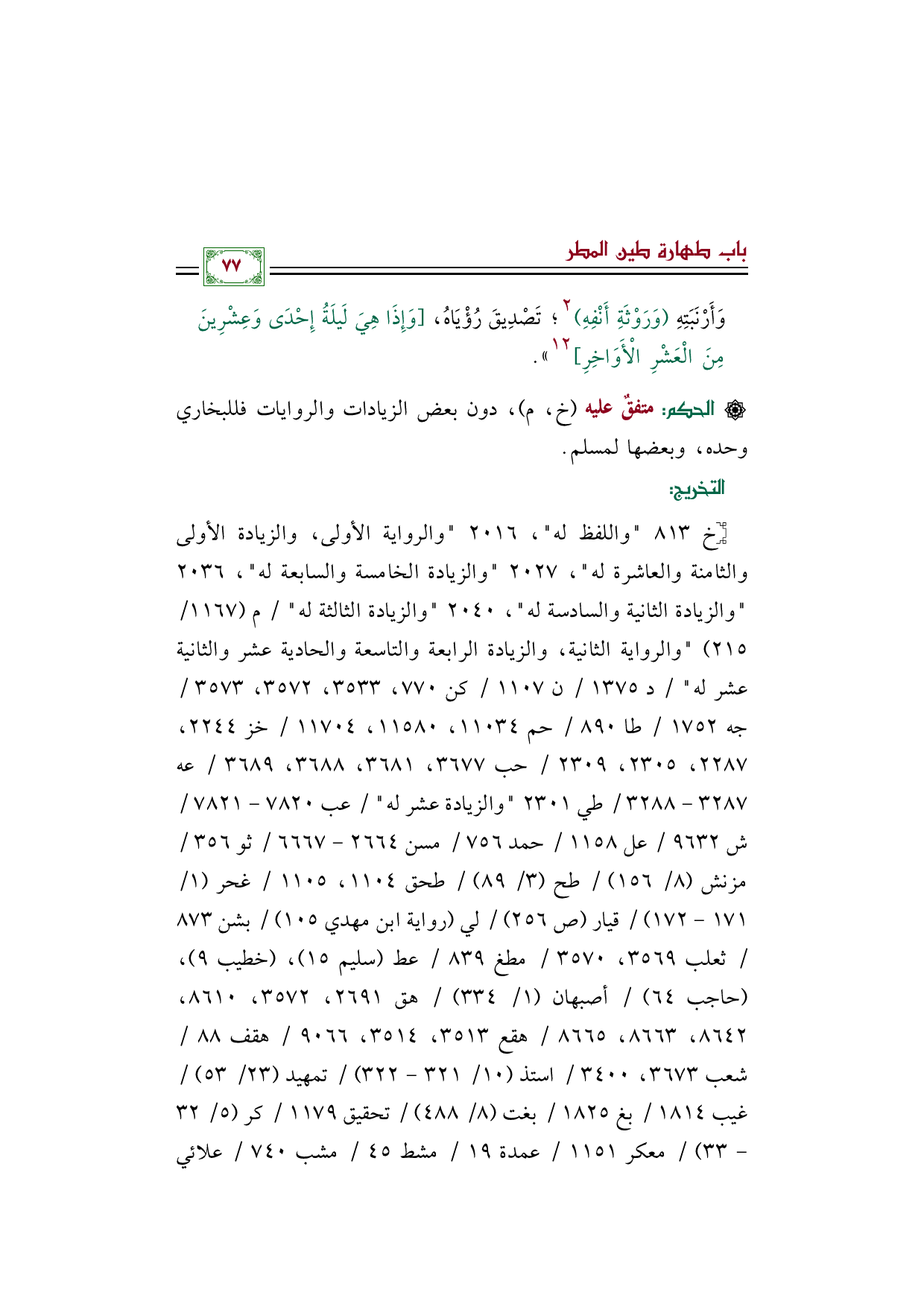 [خ ٨١٣ ((واللفظ له))، ٢٠١٦ ((والرواية الأولى، والزيادة الأولى والثامنة والعاشرة له))، ٢٠٢٧ ((والزيادة الخامسة والسابعة له))، ٢٠٣٦ ((والزيادة الثانية والسادسة له))، ٢٠٤٠ ((والزيادة الثالثة له)) / م (١١٦٧/ ٢١٥) ((والرواية الثانية، والزيادة الرابعة والتاسعة والحادية عشر والثانية عشر له)) / د ١٣٧٥/ ن ١١٠٧/ كن ٧٧٠، ٣٥٣٣، ٣٥٧٢، ٣٥٧٣/ جه ١٧٥٢/ طا ٨٩٠/ حم ١١٠٣٤، ١١٥٨٠، ١١٧٠٤/ خز ٢٢٤٤، ٢٢٨٧، ٢٣٠٥، ٢٣٠٩/ حب ٣٦٧٧، ٣٦٨١، ٣٦٨٨، ٣٦٨٩/ عه ٣٢٨٧ - ٣٢٨٨/ طي ٢٣٠١ ((والزيادة عشر له)) / عب ٧٨٢٠ - ٧٨٢١/ ش ٩٦٣٢/ عل ١١٥٨/ حمد ٧٥٦/ مسن ٢٦٦٤ - ٦٦٦٧/ ثو ٣٥٦/ مزنش (٨/ ١٥٦) / طح (٣/ ٨٩) / طحق ١١٠٤، ١١٠٥/ غحر (١/ ١٧١ - ١٧٢) / قيار (ص ٢٥٦) / لي (رواية ابن مهدي ١٠٥) / بشن ٨٧٣/ ثعلب ٣٥٦٩، ٣٥٧٠ / مطغ ٨٣٩/ عط (سليم ١٥)، (خطيب ٩)، (حاجب ٦٤) / أصبهان (١/ ٣٣٤) / هق ٢٦٩١، ٣٥٧٢، ٨٦١٠، ٨٦٤٢، ٨٦٦٣، ٨٦٦٥/ هقع ٣٥١٣، ٣٥١٤، ٩٠٦٦/ هقف ٨٨/ شعب ٣٦٧٣، ٣٤٠٠/ استذ (١٠/ ٣٢١ - ٣٢٢) / تمهيد (٢٣/ ٥٣) / غيب ١٨١٤/ بغ ١٨٢٥/ بغت (٨/ ٤٨٨) / تحقيق ١١٧٩/ كر (٥/ ٣٢ - ٣٣) / معكر ١١٥١/ عمدة ١٩/ مشط ٤٥/ مشب ٧٤٠/ علائي