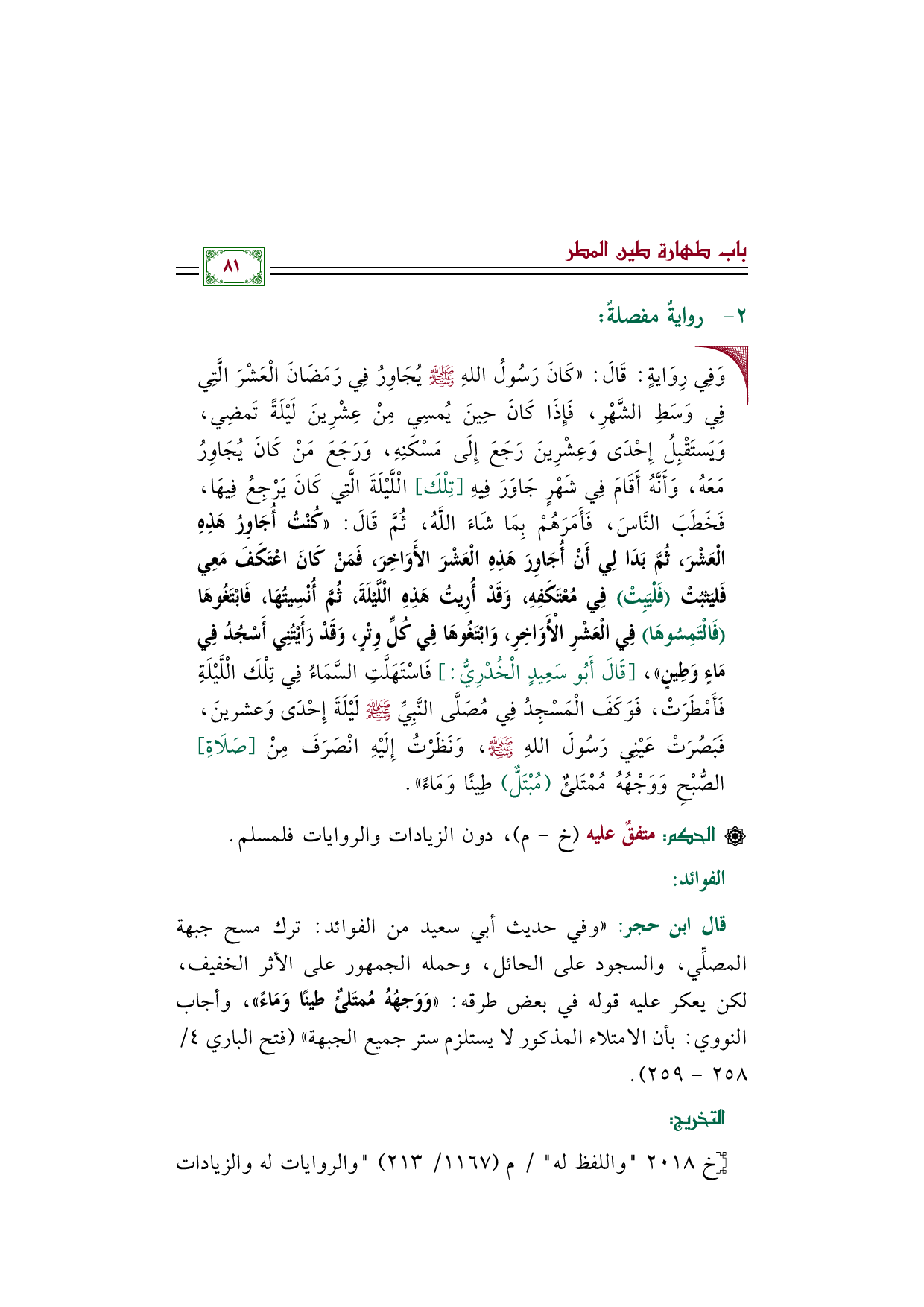 قال ابن حجر: ((وفي حديث أبي سعيد من الفوائد: ترك مسح جبهة المصلِّي، والسجود على الحائل، وحمله الجمهور على الأثر الخفيف، لكن يعكر عليه قوله في بعض طرقه: ((وَوَجهُهُ مُمتَلئٌ طينًا وَمَاءً))، وأجاب النووي: بأن الامتلاء المذكور لا يستلزم ستر جميع الجبهة)) (فتح الباري ٤/ ٢٥٨ - ٢٥٩).