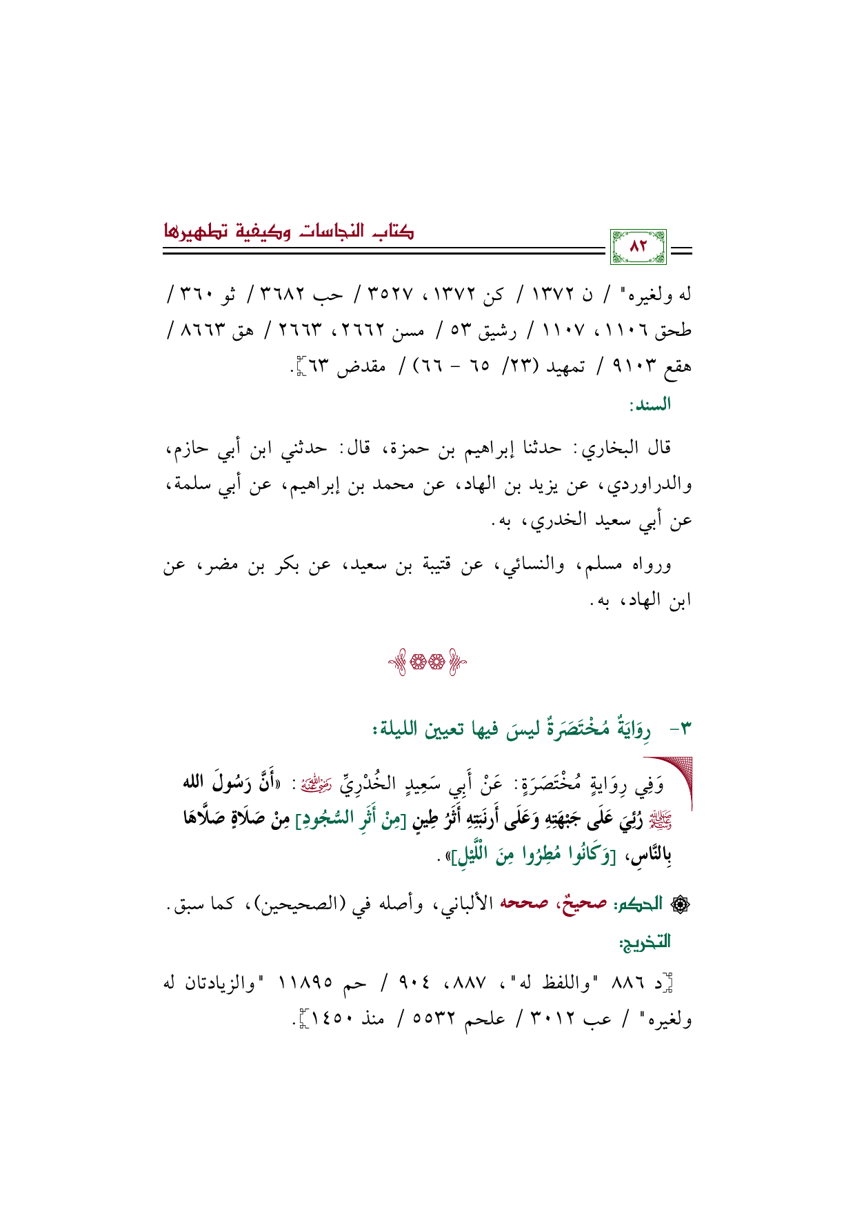 • وَفِي رِوَايةٍ مُخْتَصَرَةٍ: عَنْ أَبِي سَعِيدٍ الخُدْرِيِّ رضي الله عنه: ((أَنَّ رَسُولَ الله صلى الله عليه وسلم رُئِيَ عَلَى جَبْهَتِهِ وَعَلَى أَرنَبَتِهِ أَثَرُ طِينٍ [مِنْ أَثَرِ السُّجُودِ] مِنْ صَلَاةٍ صَلَّاهَا بِالنَّاسِ، [وَكَانُوا مُطِرُوا مِنَ الْلَّيْلِ])).