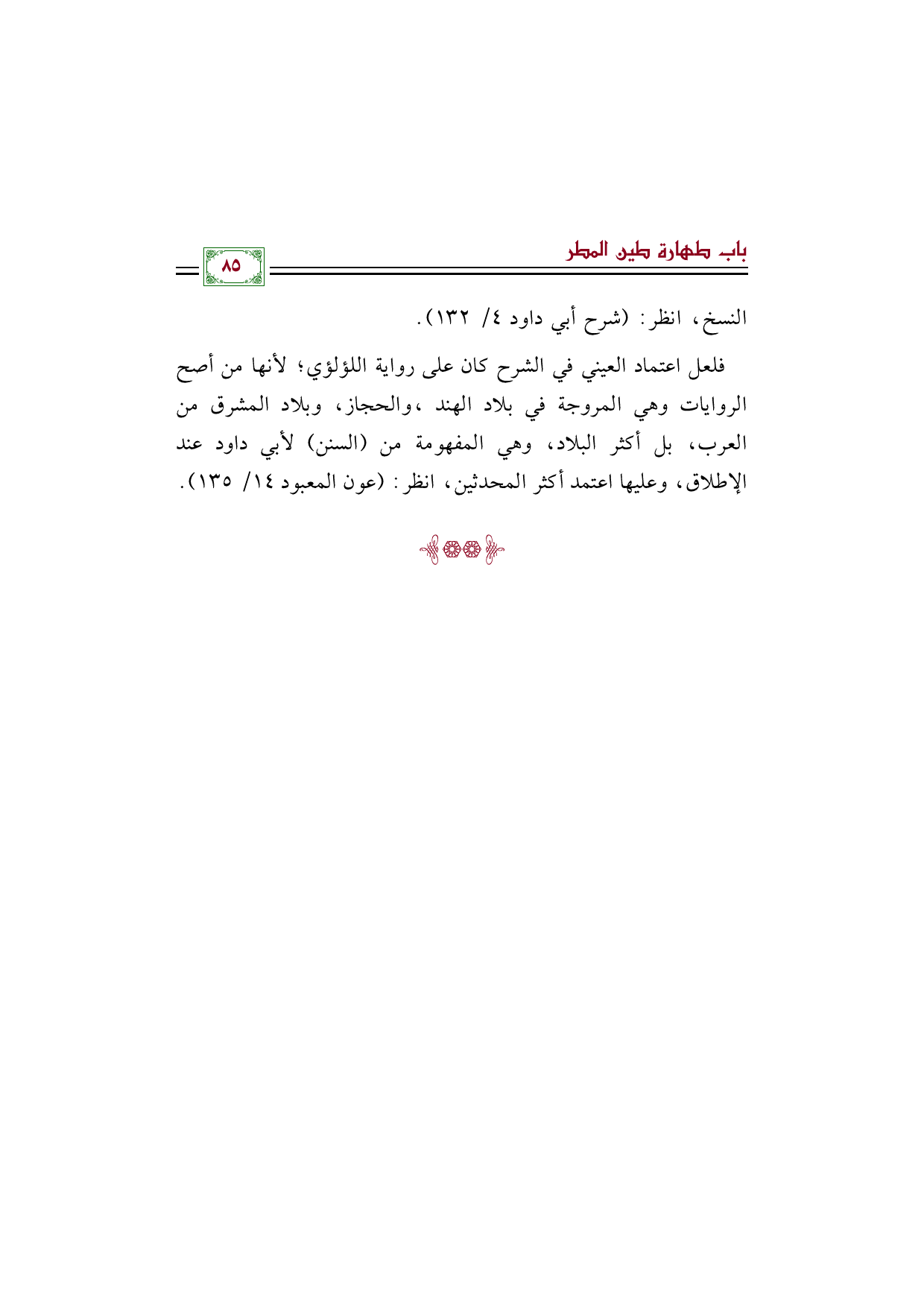 فلعل اعتماد العيني في الشرح كان على رواية اللؤلؤي؛ لأنها من أصح الروايات وهي المروجة في بلاد الهند، والحجاز، وبلاد المشرق من العرب، بل أكثر البلاد، وهي المفهومة من (السنن) لأبي داود عند الإطلاق، وعليها اعتمد أكثر المحدثين، انظر: (عون المعبود ١٤/ ١٣٥).