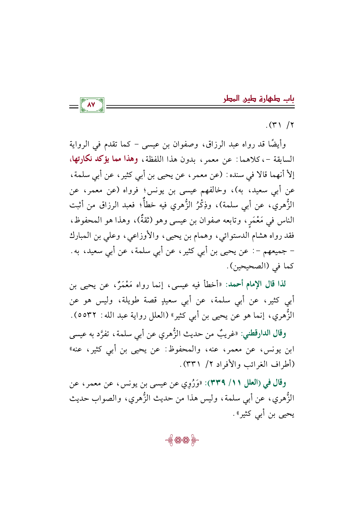 وقال الدارقطني: ((غريبٌ من حديث الزُّهري عن أبي سلمة، تفرَّد به عيسى بن يونس، عن معمر، عنه، والمحفوظ: عن يحيى بن أبي كثير، عنه)) (أطراف الغرائب والأفراد ٢/ ٣٣١).