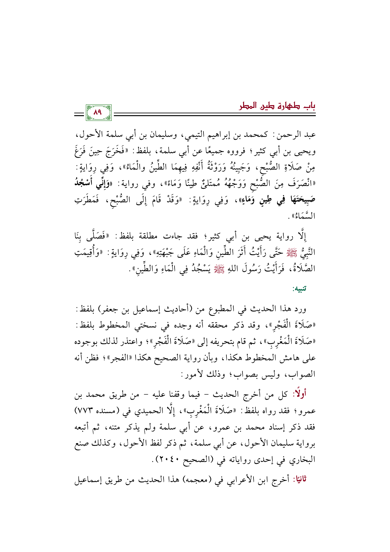 إِلَّا رواية يحيى بن أبي كثير؛ فقد جاءت مطلقة بلفظ: ((فَصَلَّى بِنَا النَّبِيُّ صلى الله عليه وسلم حَتَّى رَأَيْتُ أَثَرَ الطِّينِ وَالْمَاءِ عَلَى جَبْهَتِهِ))، وَفِي رِوَايةٍ: ((وَأُقِيمَتِ الصَّلَاةُ، فَرَأَيْتُ رَسُولَ اللهِ صلى الله عليه وسلم يَسْجُدُ فِي الْمَاءِ وَالطِّينِ)).