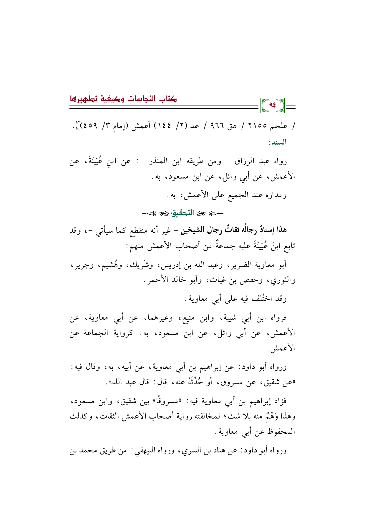 فرواه ابن أبي شيبة، وابن منيع، وغيرهما، عن أبي معاوية، عن الأعمش، عن أبي وائل، عن ابن مسعود، به. كرواية الجماعة عن الأعمش.