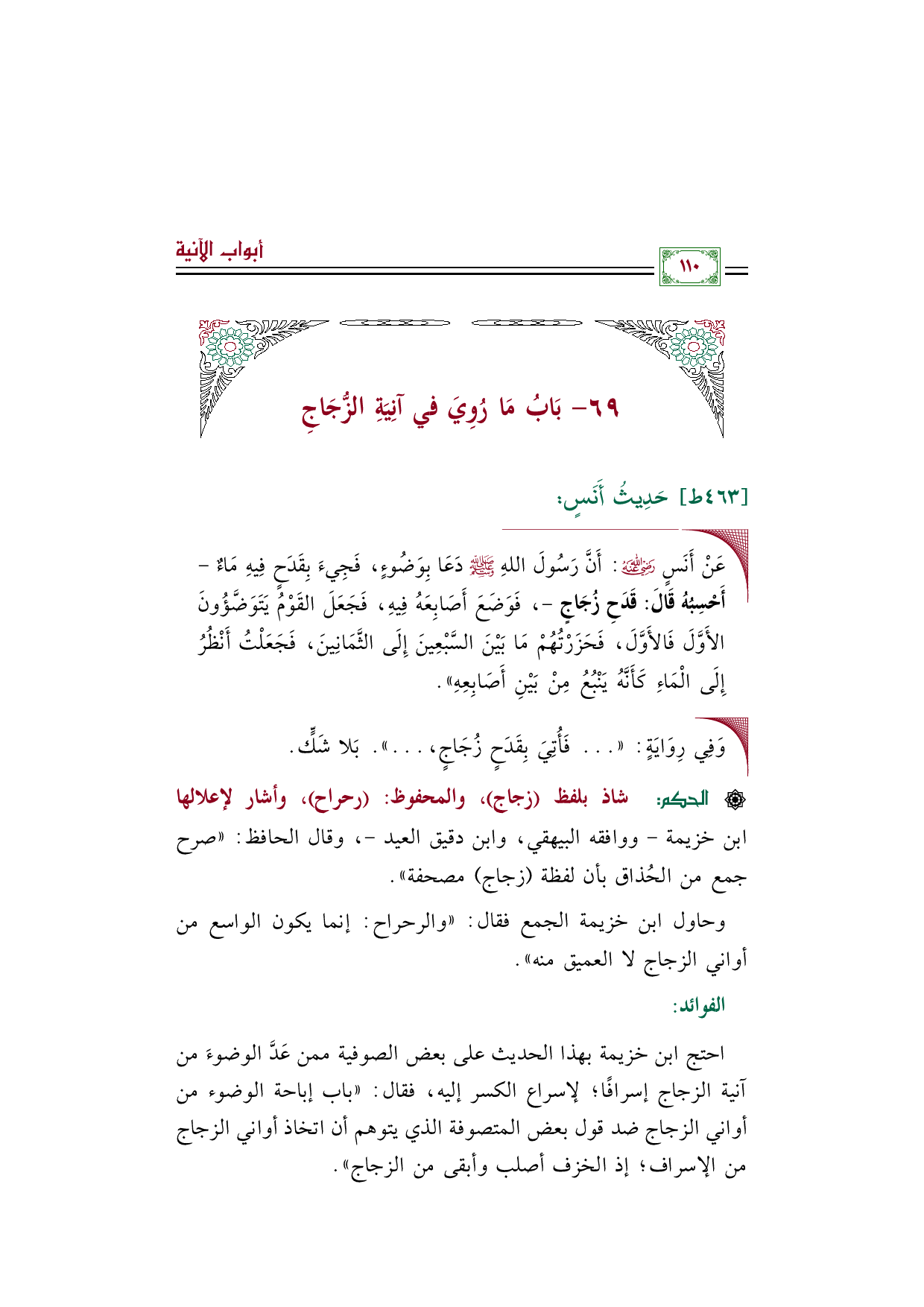 احتج ابن خزيمة بهذا الحديث على بعض الصوفية ممن عَدَّ الوضوءَ من آنية الزجاج إسرافًا؛ لإسراع الكسر إليه، فقال: ((باب إباحة الوضوء من أواني الزجاج ضد قول بعض المتصوفة الذي يتوهم أن اتخاذ أواني الزجاج من الإسراف؛ إذ الخزف أصلب وأبقى من الزجاج)).