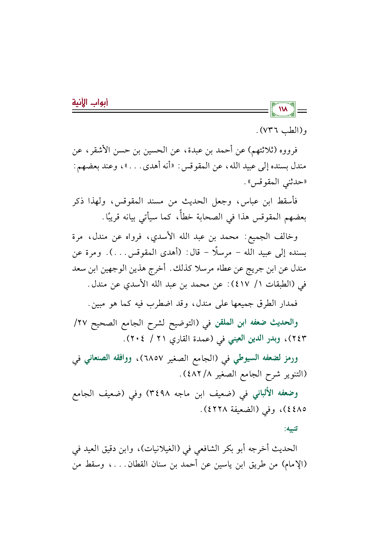 فرووه (ثلاثتهم) عن أحمد بن عبدة، عن الحسين بن حسن الأشقر، عن مندل بسنده إلى عبيد الله، عن المقوقس: ((أنه أهدى ... ))، وعند بعضهم: ((حدثني المقوقس)).
