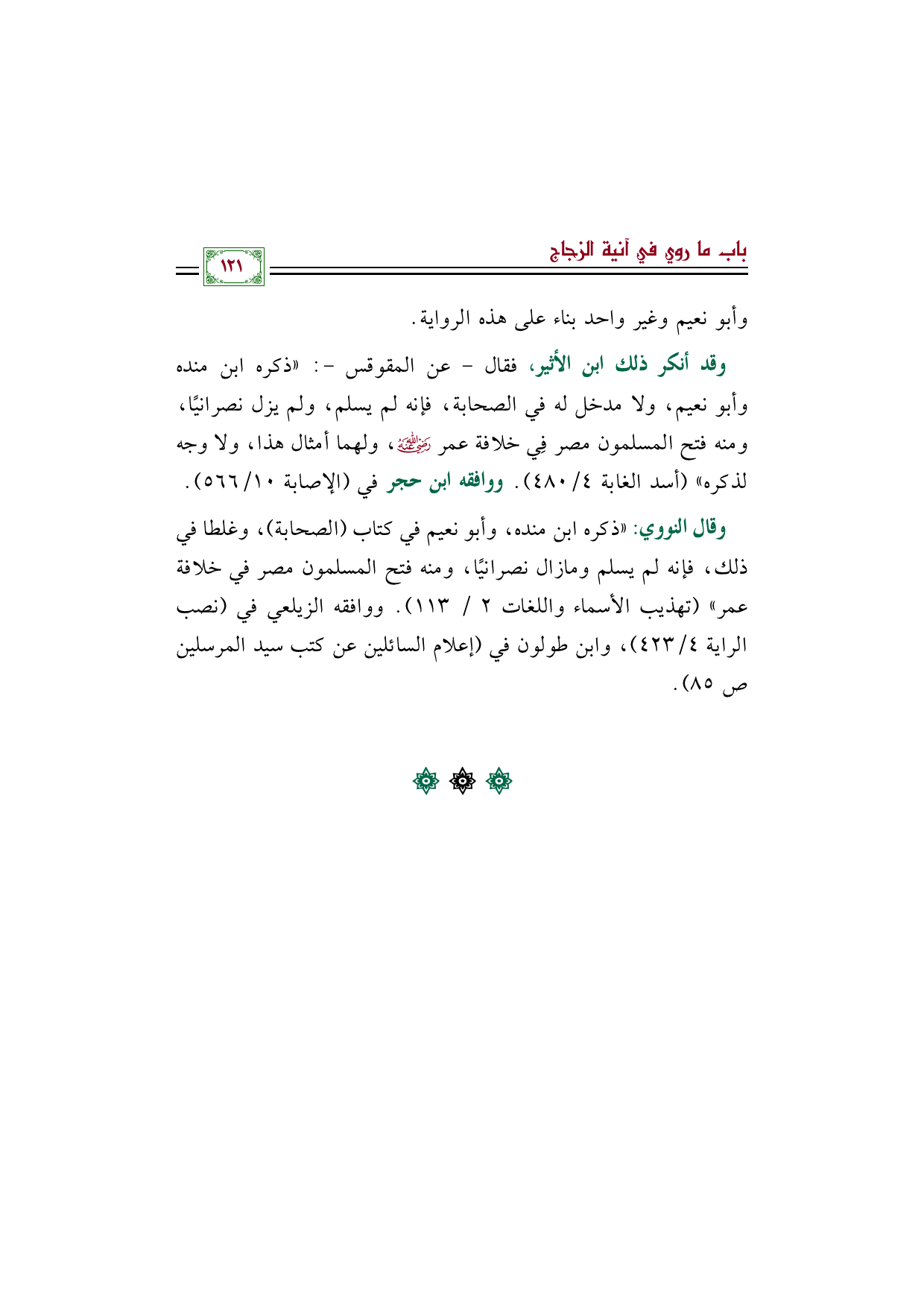 وقد أنكر ذلك ابن الأثير، فقال - عن المقوقس -: ((ذكره ابن منده وأبو نعيم، ولا مدخل له في الصحابة، فإنه لم يسلم، ولم يزل نصرانيًا، ومنه فتح المسلمون مصر فِي خلافة عمر رضي الله عنه، ولهما أمثال هذا، ولا وجه لذكره)) (أسد الغابة ٤/ ٤٨٠). ووافقه ابن حجر في (الإصابة ١٠/ ٥٦٦).