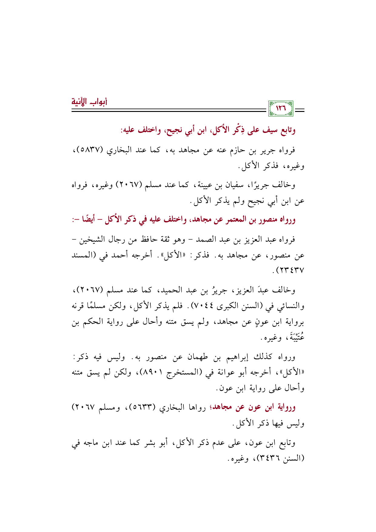 وتابع سيف على ذِكْر الأكل، ابن أبي نجيح، واختلف عليه: