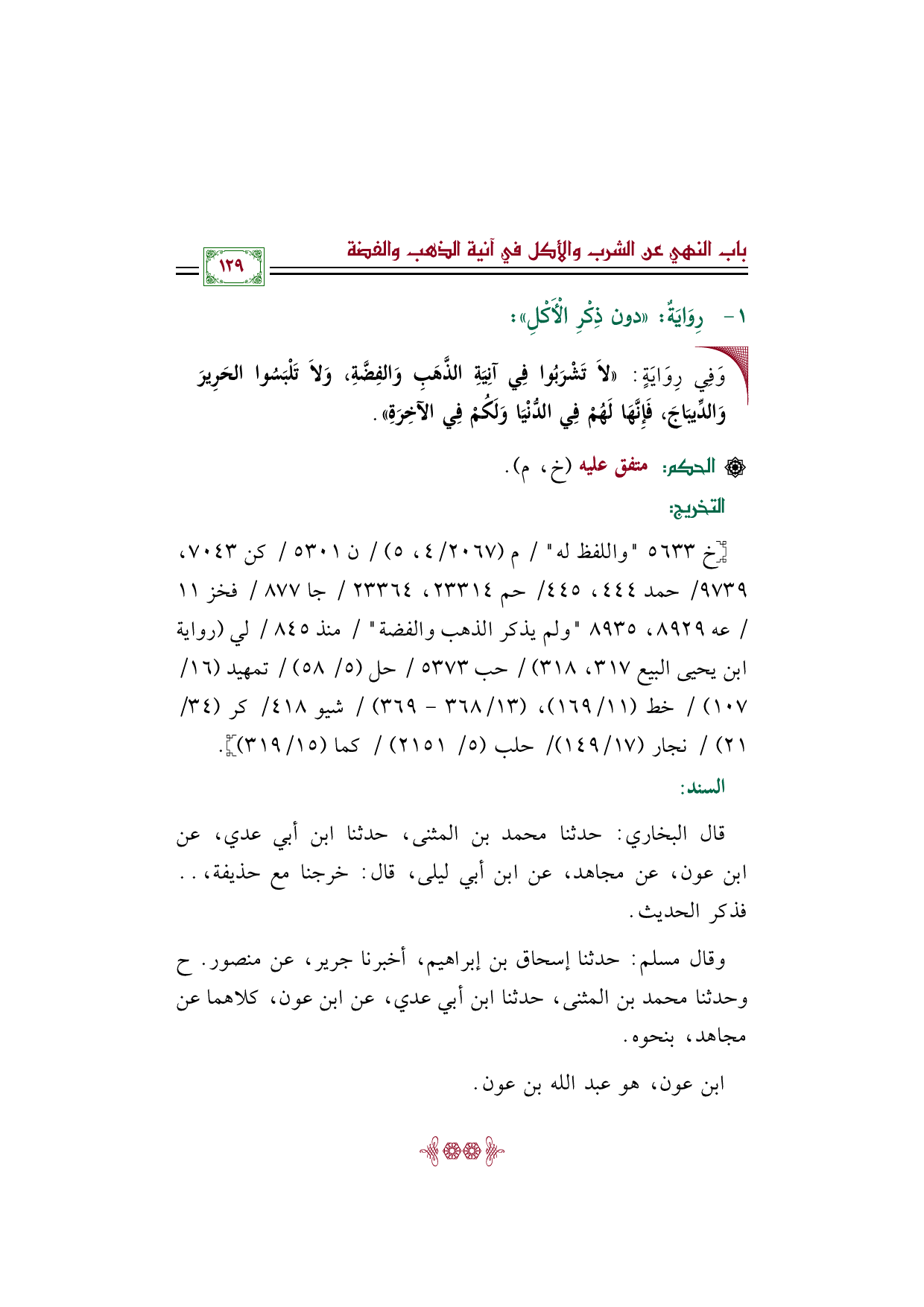 [خ ٥٦٣٣ "واللفظ له" / م (٢٠٦٧/ ٤، ٥) / ن ٥٣٠١ / كن ٧٠٤٣، ٩٧٣٩/ حمد ٤٤٤، ٤٤٥/ حم ٢٣٣١٤، ٢٣٣٦٤ / جا ٨٧٧ / فخز ١١ / عه ٨٩٢٩، ٨٩٣٥ "ولم يذكر الذهب والفضة" / منذ ٨٤٥ / لي (رواية ابن يحيى البيع ٣١٧، ٣١٨) / حب ٥٣٧٣ / حل (٥/ ٥٨) / تمهيد (١٦/ ١٠٧) / خط (١١/ ١٦٩)، (١٣/ ٣٦٨ - ٣٦٩) / شيو ٤١٨/ كر (٣٤/ ٢١) / نجار (١٧/ ١٤٩) / حلب (٥/ ٢١٥١) / كما (١٥/ ٣١٩)].