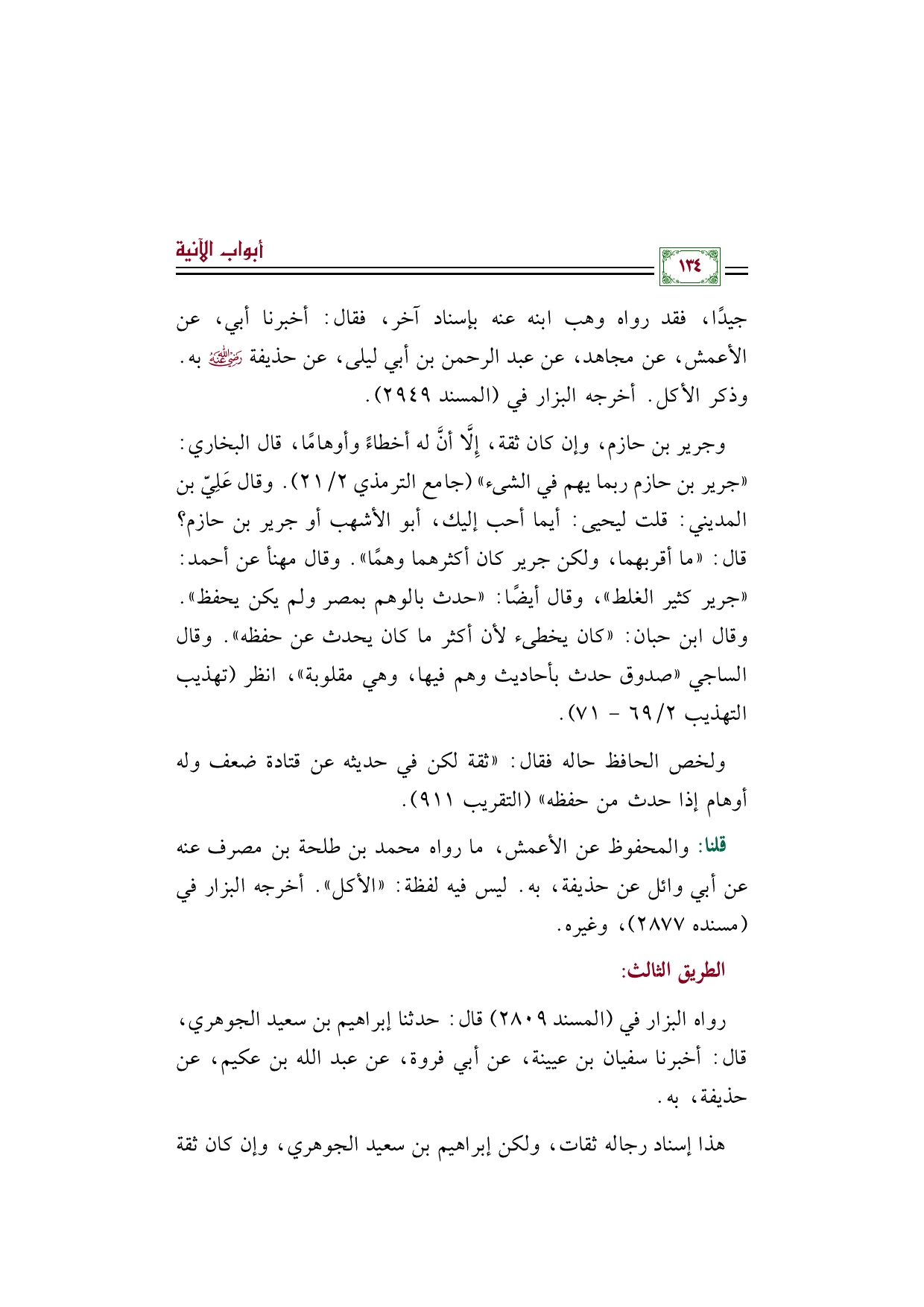 وجرير بن حازم، وإن كان ثقة، إِلَّا أنَّ له أخطاءً وأوهامًا، قال البخاري: ((جرير بن حازم ربما يهم في الشئ)) (جامع الترمذي ٢/ ٢١). وقال عَلِيّ بن المديني: قلت ليحيى: أيما أحب إليك، أبو الأشهب أو جرير بن حازم؟ قال: ((ما أقربهما، ولكن جرير كان أكثرهما وهمًا)). وقال مهنأ عن أحمد: ((جرير كثير الغلط))، وقال أيضًا: ((حدث بالوهم بمصر ولم يكن يحفظ)). وقال ابن حبان: ((كان يخطئ لأن أكثر ما كان يحدث عن حفظه)). وقال الساجي ((صدوق حدث بأحاديث وهم فيها، وهي مقلوبة))، انظر (تهذيب التهذيب ٢/ ٦٩ - ٧١).