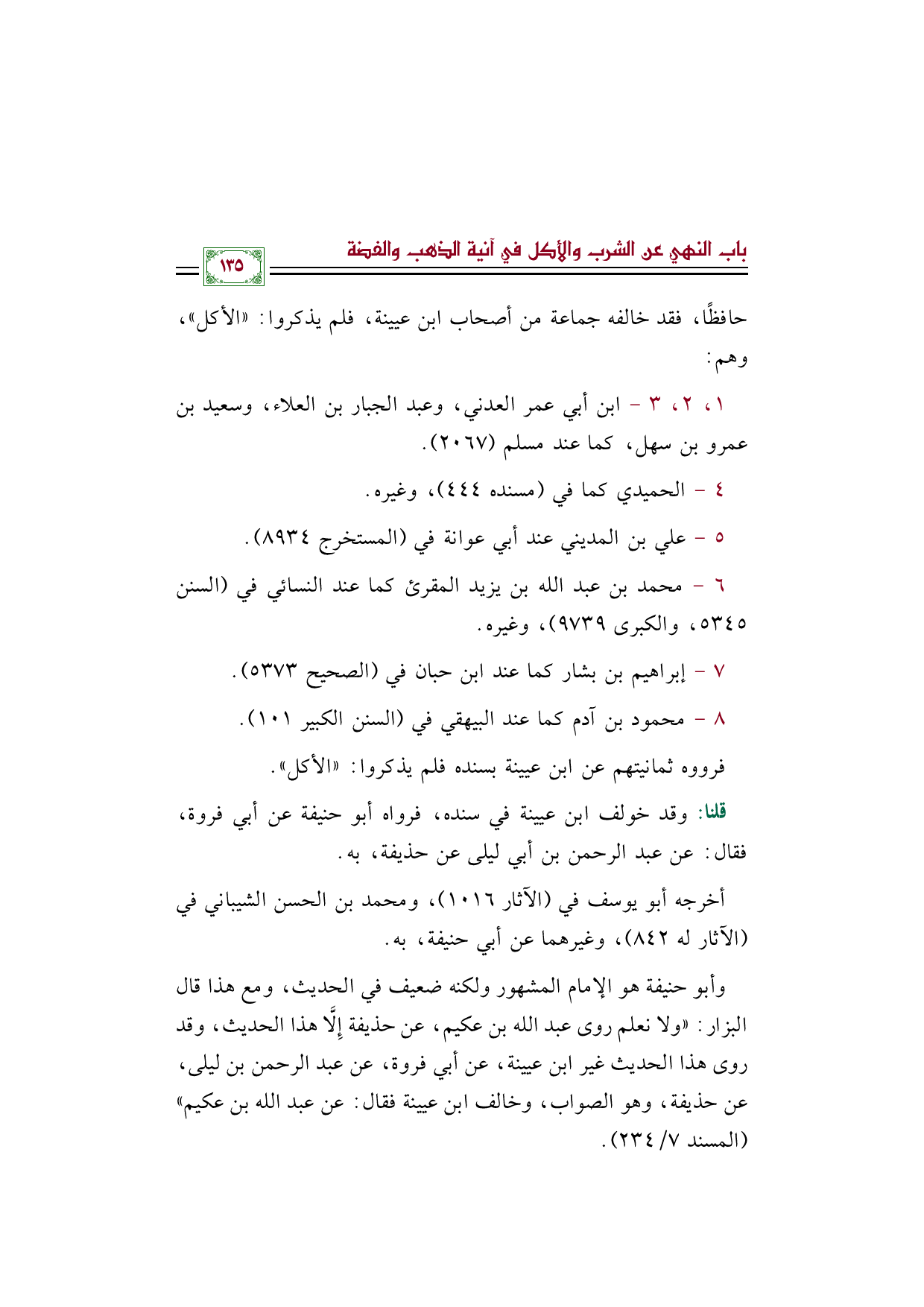 وأبو حنيفة هو الإمام المشهور ولكنه ضعيف في الحديث، ومع هذا قال البزار: ((ولا نعلم روى عبد الله بن عكيم، عن حذيفة إِلَّا هذا الحديث، وقد روى هذا الحديث غير ابن عيينة، عن أبي فروة، عن عبد الرحمن بن ليلى، عن حذيفة، وهو الصواب، وخالف ابن عيينة فقال: عن عبد الله بن عكيم)) (المسند ٧/ ٢٣٤).