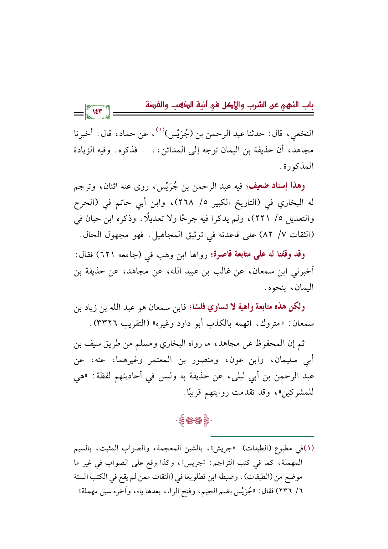 وهذا إسناد ضعيف؛ فيه عبد الرحمن بن جُرَيْس، روى عنه اثنان، وترجم له البخاري في (التاريخ الكبير ٥/ ٢٦٨)، وابن أبي حاتم في (الجرح والتعديل ٥/ ٢٢١)، ولم يذكرا فيه جرحًا ولا تعديلًا. وذكره ابن حبان في (الثقات ٧/ ٨٢) على قاعدته في توثيق المجاهيل. فهو مجهول الحال.