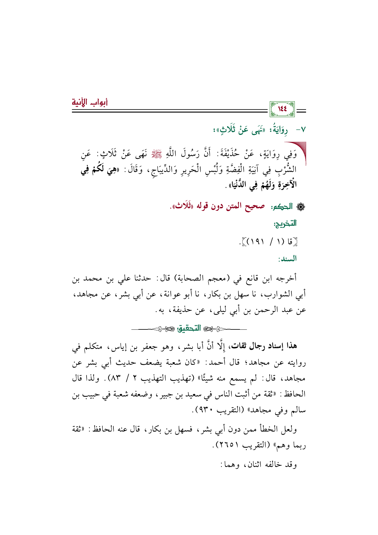 أخرجه ابن قانع في (معجم الصحابة) قال: حدثنا علي بن محمد بن أبي الشوارب، نا سهل بن بكار، نا أبو عوانة، عن أبي بشر، عن مجاهد، عن عبد الرحمن بن أبي ليلى، عن حذيفة، به.