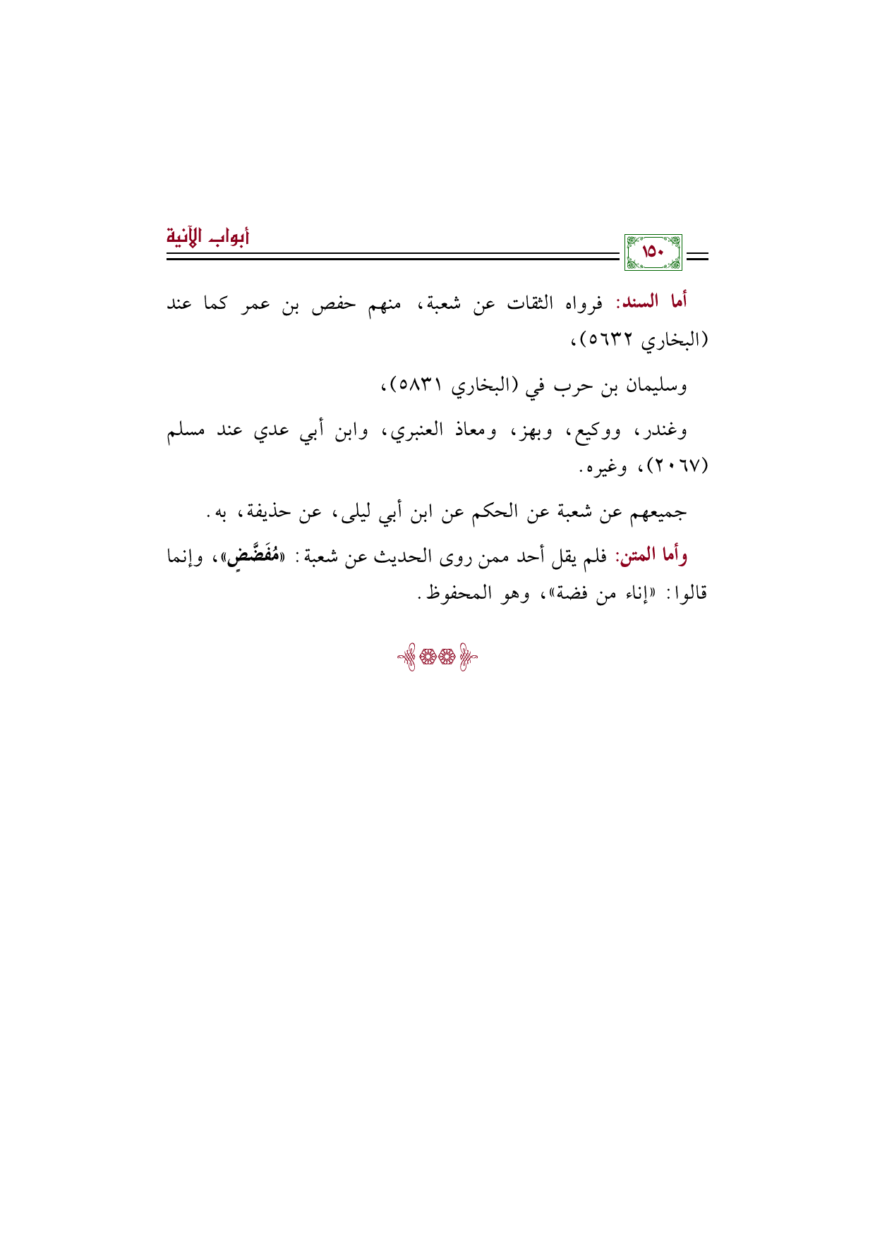 وأما المتن: فلم يقل أحد ممن روى الحديث عن شعبة: ((مُفَضَّضٍ))، وإنما قالوا: ((إناء من فضة))، وهو المحفوظ.