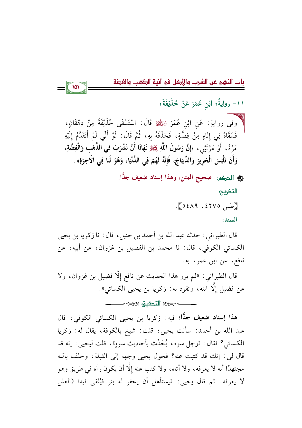 • وفي روايةٍ: عَنِ ابْنِ عُمَرَ رضي الله عنه قَالَ: اسْتَسْقَى حُذَيْفَةُ مِنْ دِهْقَانٍ، فَسَقَاهُ فِي إِنَاءٍ مِنْ فِضَّةٍ، فَحَذَفَهُ بِهِ، ثُمَّ قَالَ: لَوْ أَنِّي لَمْ أَتَقَدَّمْ إِلَيْهِ مَرَّةً، أَوْ مَرَّتَيْنِ، ((إِنَّ رَسُولَ اللَّهِ صلى الله عليه وسلم نَهَانَا أَنْ نَشْرَبَ فِي الذَّهَبِ وَالْفِضَّةِ، وَأَنْ نَلْبَسَ الْحَرِيرَ وَالدِّيبَاجَ، فَإِنَّهُ لَهُمْ فِي الدُّنْيَا، وَهُوَ لَنَا فِي الْآخِرَةِ)).