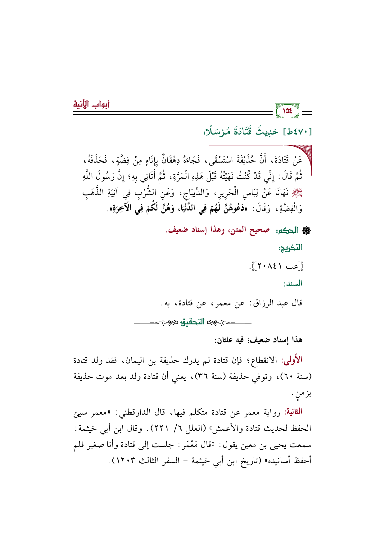 الأولى: الانقطاع؛ فإن قتادة لم يدرك حذيفة بن اليمان، فقد ولد قتادة (سنة ٦٠)، وتوفي حذيفة (سنة ٣٦)، يعني أن قتادة ولد بعد موت حذيفة بزمنٍ.