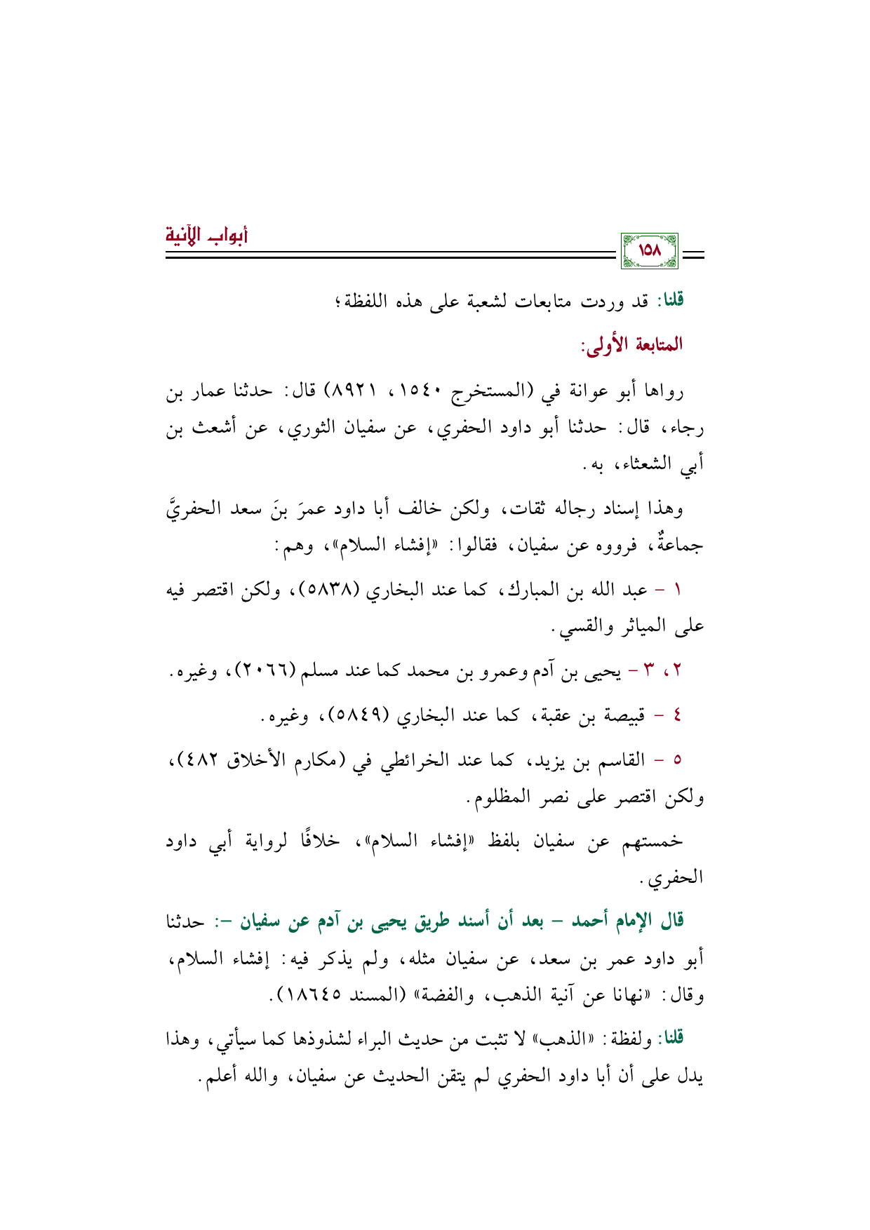 قال الإمام أحمد - بعد أن أسند طريق يحيى بن آدم عن سفيان -: حدثنا أبو داود عمر بن سعد، عن سفيان مثله، ولم يذكر فيه: إفشاء السلام، وقال: ((نهانا عن آنية الذهب، والفضة)) (المسند ١٨٦٤٥).