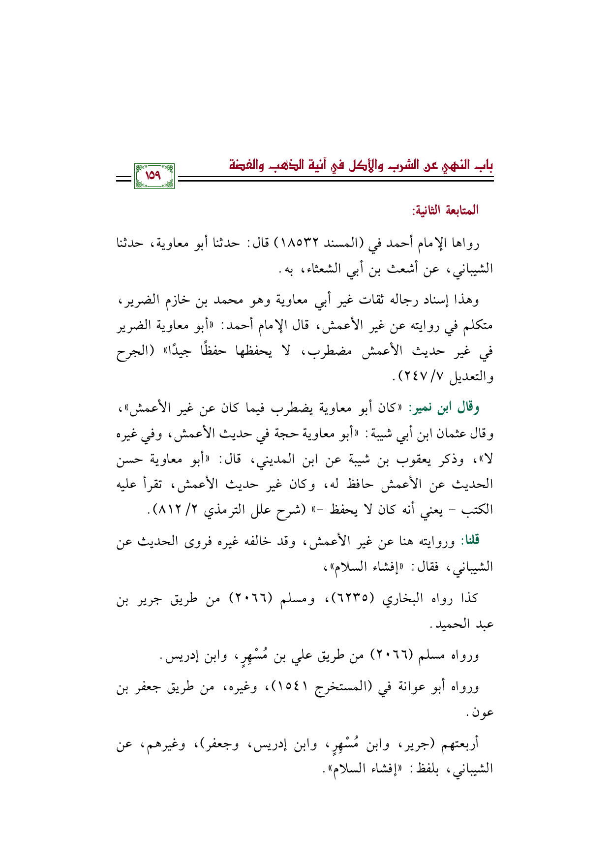 وقال ابن نمير: ((كان أبو معاوية يضطرب فيما كان عن غير الأعمش))، وقال عثمان ابن أبي شيبة: ((أبو معاوية حجة في حديث الأعمش، وفي غيره لا))، وذكر يعقوب بن شيبة عن ابن المديني، قال: ((أبو معاوية حسن الحديث عن الأعمش حافظ له، وكان غير حديث الأعمش، تقرأ عليه الكتب - يعني أنه كان لا يحفظ -)) (شرح علل الترمذي ٢/ ٨١٢).