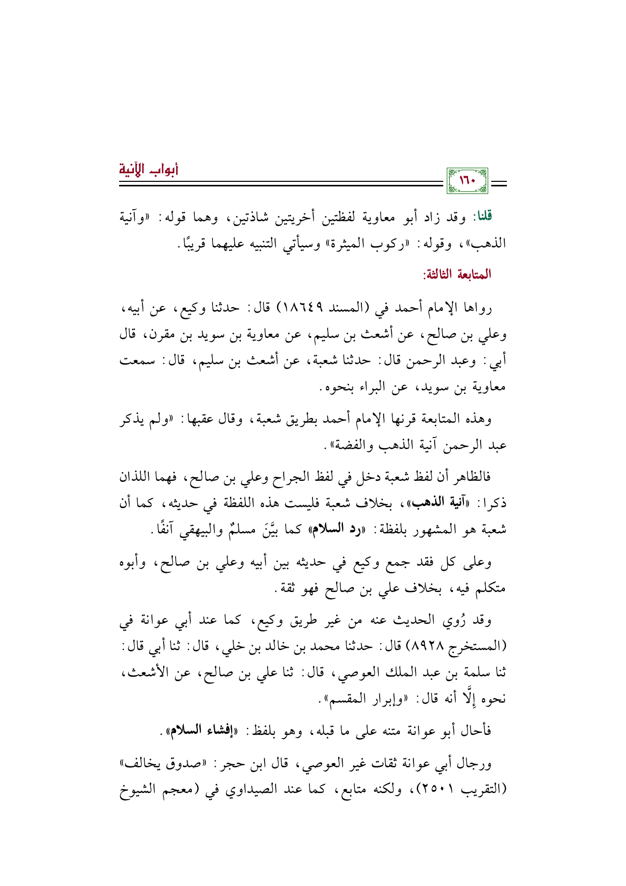 وهذه المتابعة قرنها الإمام أحمد بطريق شعبة، وقال عقبها: ((ولم يذكر عبد الرحمن آنية الذهب والفضة)).