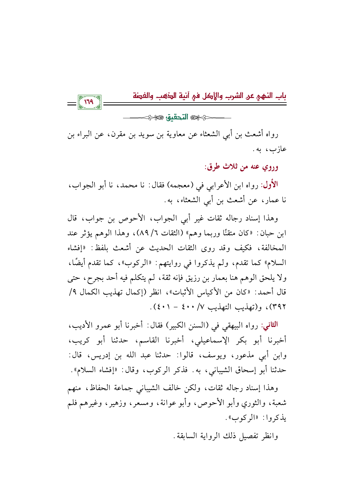 وهذا إسناد رجاله ثقات غير أبي الجواب، الأحوص بن جواب، قال ابن حبان: ((كان متقنًا وربما وهم)) (الثقات ٦/ ٨٩)، وهذا الوهم يؤثر عند المخالفة، فكيف وقد روى الثقات الحديث عن أشعث بلفظ: ((إفشاء السلام)) كما تقدم، ولم يذكروا في روايتهم: ((الركوب))، كما تقدم أيضًا، ولا يلحق الوهم هنا بعمار بن رزيق فإنه ثقة، لم يتكلم فيه أحد بجرح، حتى قال أحمد: ((كان من الأكياس الأثبات))، انظر (إكمال تهذيب الكمال ٩/ ٣٩٢)، و (تهذيب التهذيب ٧/ ٤٠٠ - ٤٠١).