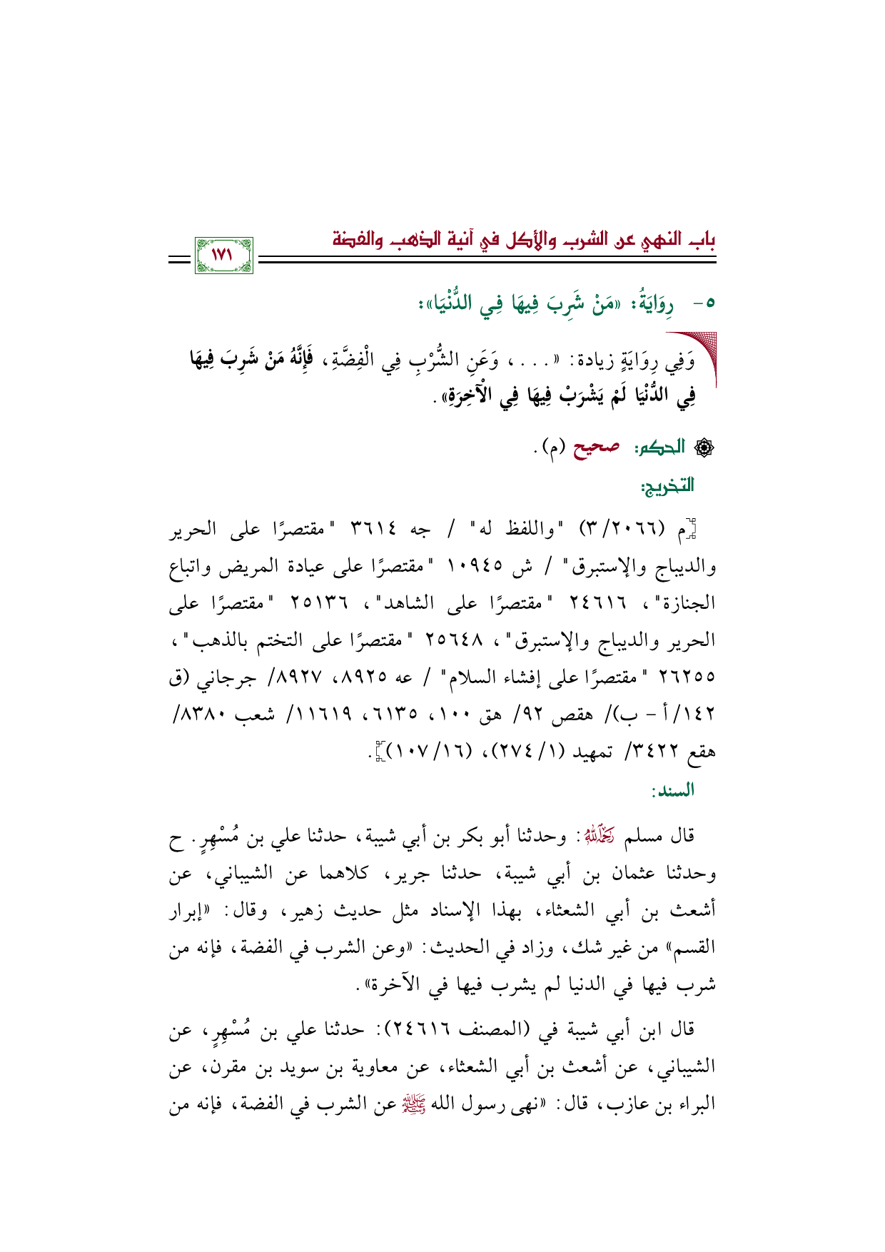 قال مسلم رحمه الله: وحدثنا أبو بكر بن أبي شيبة، حدثنا علي بن مُسْهِرٍ. ح وحدثنا عثمان بن أبي شيبة، حدثنا جرير، كلاهما عن الشيباني، عن أشعث بن أبي الشعثاء، بهذا الإسناد مثل حديث زهير، وقال: ((إبرار القسم)) من غير شك، وزاد في الحديث: ((وعن الشرب في الفضة، فإنه من شرب فيها في الدنيا لم يشرب فيها في الآخرة)).