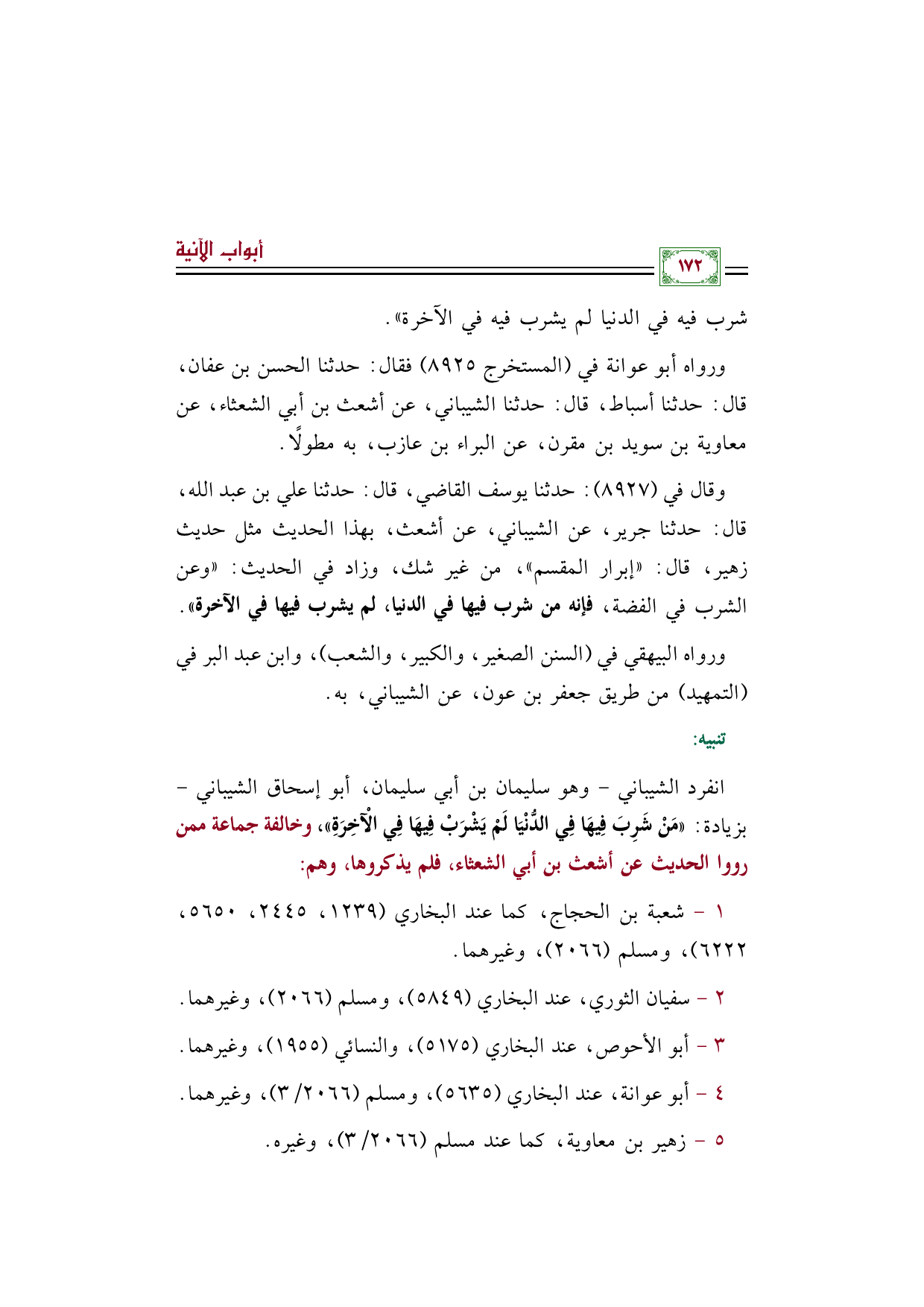 انفرد الشيباني - وهو سليمان بن أبي سليمان، أبو إسحاق الشيباني - بزيادة: ((مَنْ شَرِبَ فِيهَا فِي الدُّنْيَا لَمْ يَشْرَبْ فِيهَا فِي الْآخِرَةِ))، وخالفة جماعة ممن رووا الحديث عن أشعث بن أبي الشعثاء، فلم يذكروها، وهم: