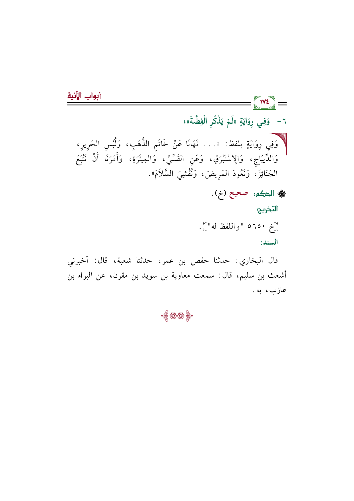 • وَفِي رِوَايَةٍ بلفظ: (( ... نَهَانَا عَنْ خَاتَمِ الذَّهَبِ، وَلُبْسِ الحَرِيرِ، وَالدِّيبَاجِ، وَالإِسْتَبْرَقِ، وَعَنِ القَسِّيِّ، وَالمِيثَرَةِ، وَأَمَرَنَا أَنْ نَتْبَعَ الجَنَائِزَ، وَنَعُودَ المَرِيضَ، وَنُفْشِيَ السَّلامَ)).