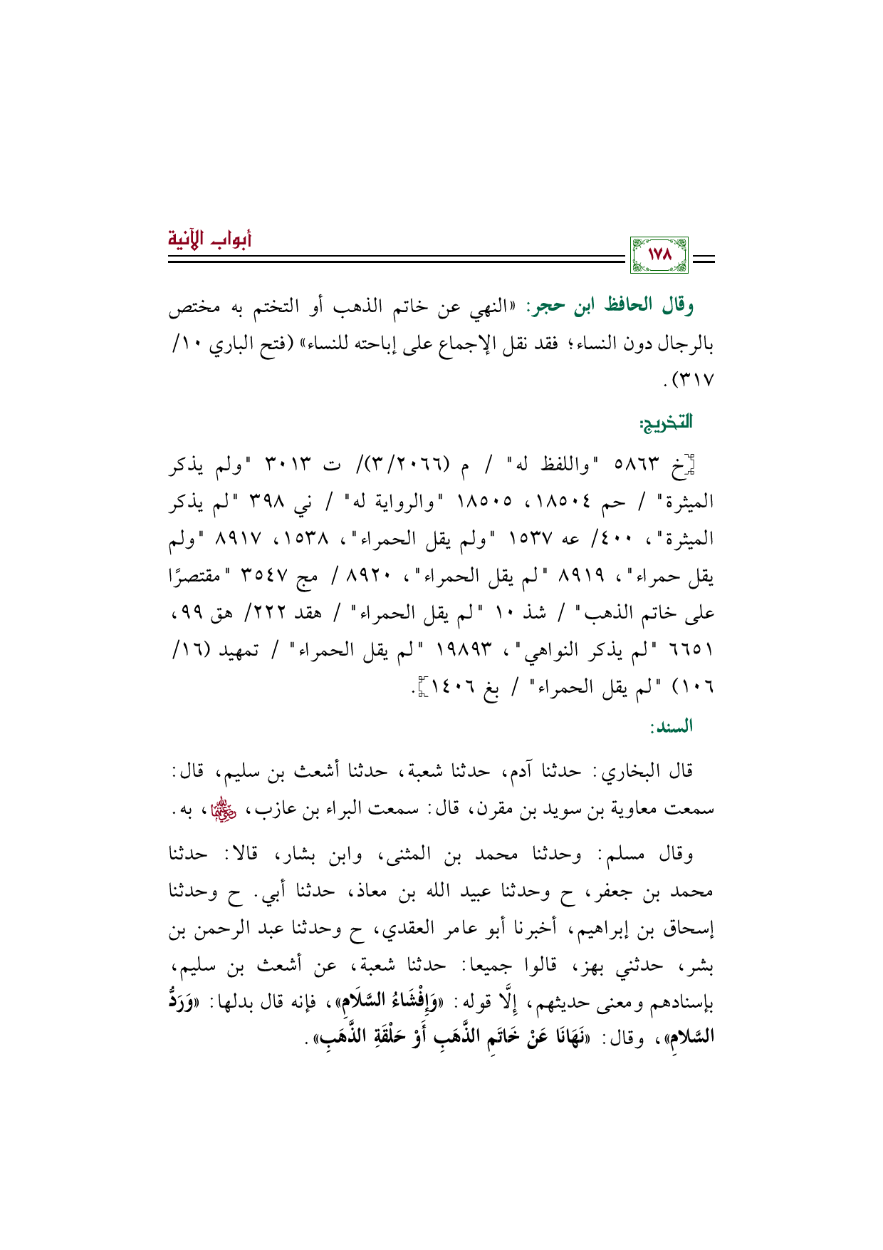 وقال مسلم: وحدثنا محمد بن المثنى، وابن بشار، قالا: حدثنا محمد بن جعفر، ح وحدثنا عبيد الله بن معاذ، حدثنا أبي. ح وحدثنا إسحاق بن إبراهيم، أخبرنا أبو عامر العقدي، ح وحدثنا عبد الرحمن بن بشر، حدثني بهز، قالوا جميعا: حدثنا شعبة، عن أشعث بن سليم، بإسنادهم ومعنى حديثهم، إِلَّا قوله: ((وَإِفْشَاءُ السَّلَامِ))، فإنه قال بدلها: ((وَرَدُّ السَّلامِ))، وقال: ((نَهَانَا عَنْ خَاتَمِ الذَّهَبِ أَوْ حَلْقَةِ الذَّهَبِ)).