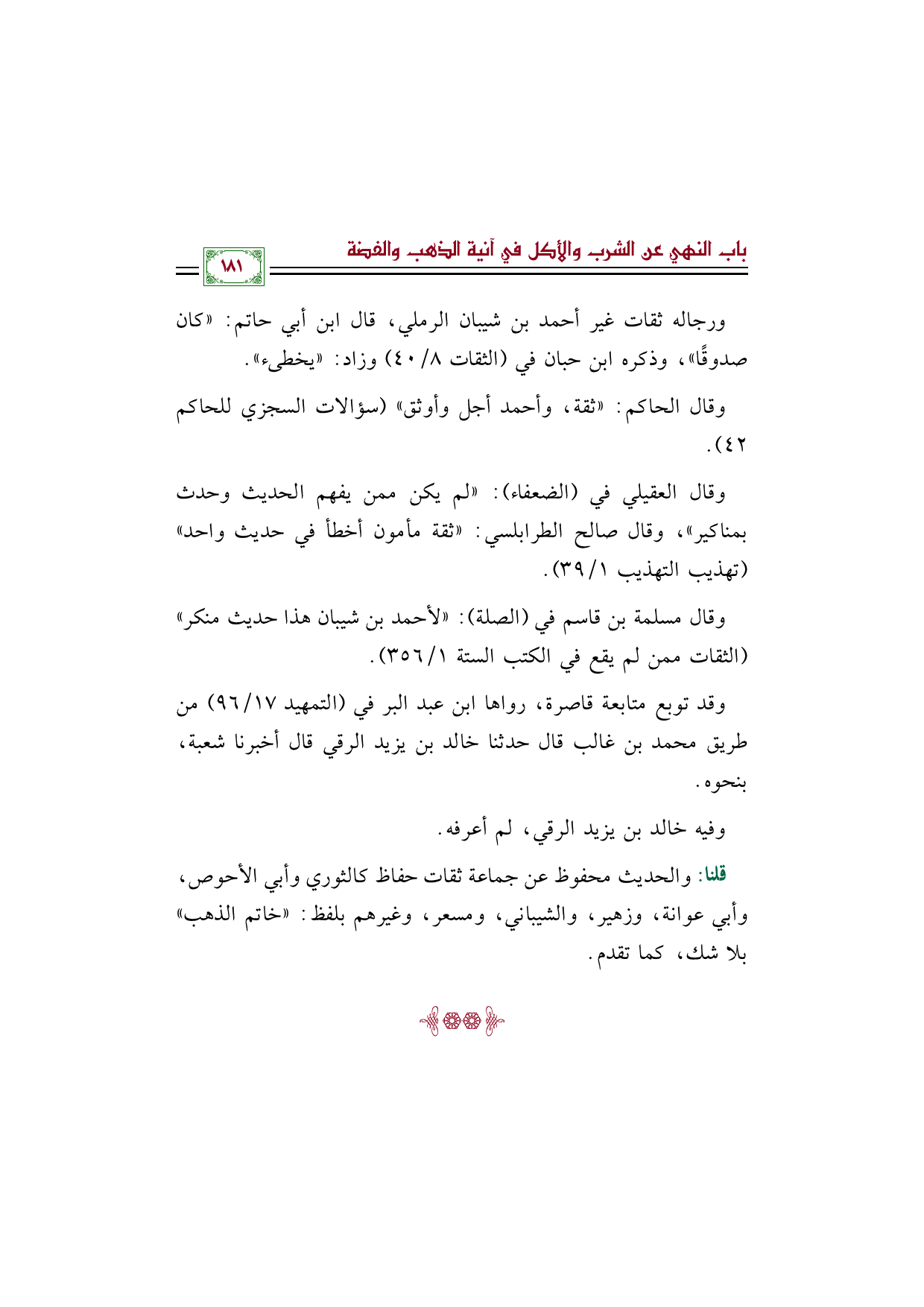 قلنا: والحديث محفوظ عن جماعة ثقات حفاظ كالثوري وأبي الأحوص، وأبي عوانة، وزهير، والشيباني، ومسعر، وغيرهم بلفظ: ((خاتم الذهب)) بلا شك، كما تقدم.