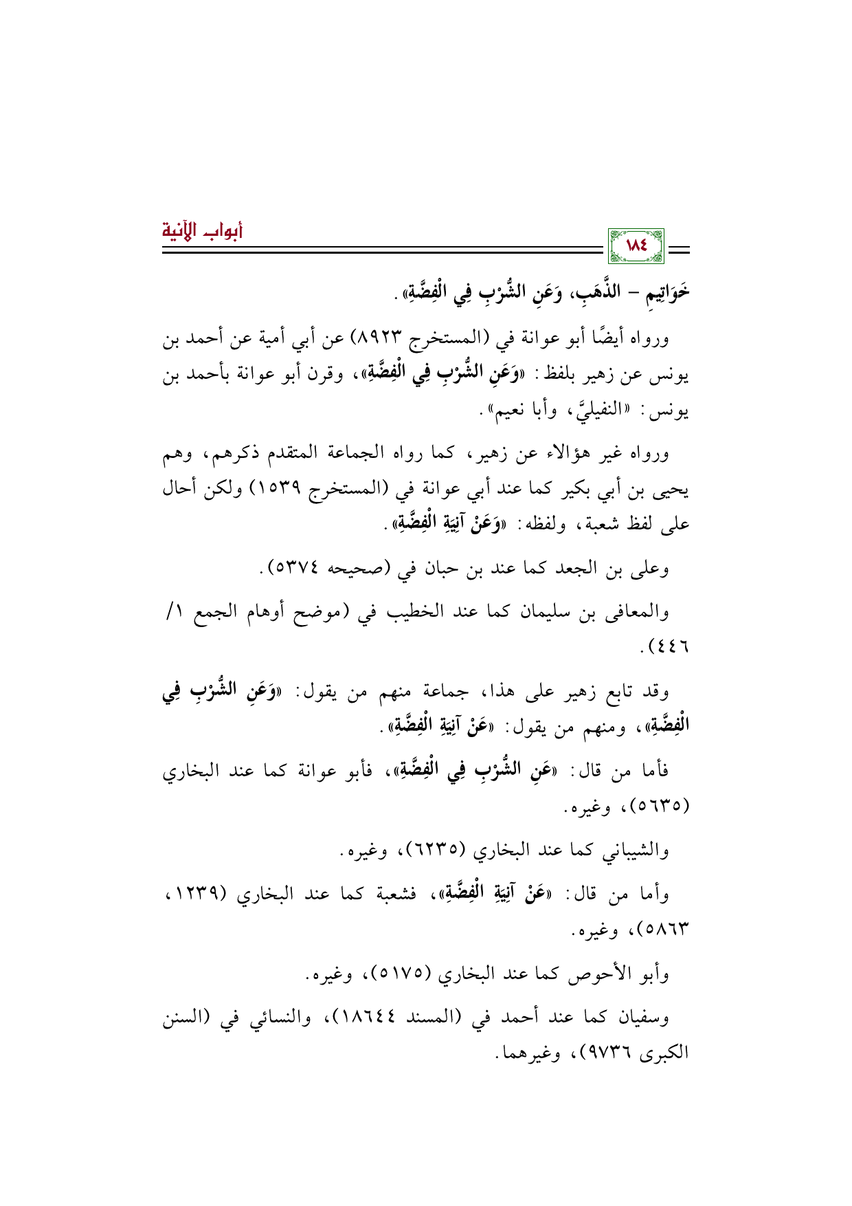 ورواه غير هؤالاء عن زهير، كما رواه الجماعة المتقدم ذكرهم، وهم يحيى بن أبي بكير كما عند أبي عوانة في (المستخرج ١٥٣٩) ولكن أحال على لفظ شعبة، ولفظه: ((وَعَنْ آنِيَةِ الْفِضَّةِ)).
