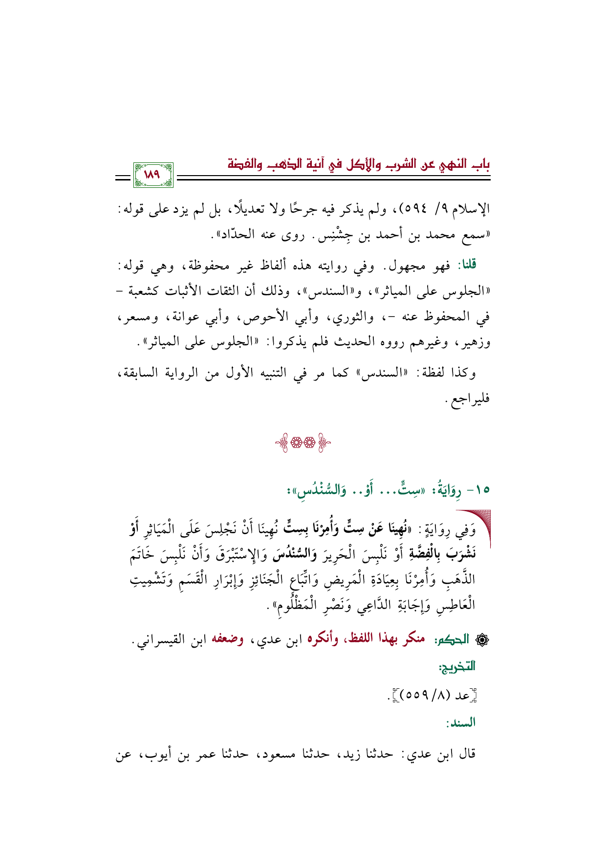 قلنا: فهو مجهول. وفي روايته هذه ألفاظ غير محفوظة، وهي قوله: ((الجلوس على المياثر))، و ((السندس))، وذلك أن الثقات الأثبات كشعبة - في المحفوظ عنه -، والثوري، وأبي الأحوص، وأبي عوانة، ومسعر، وزهير، وغيرهم رووه الحديث فلم يذكروا: ((الجلوس على المياثر)).