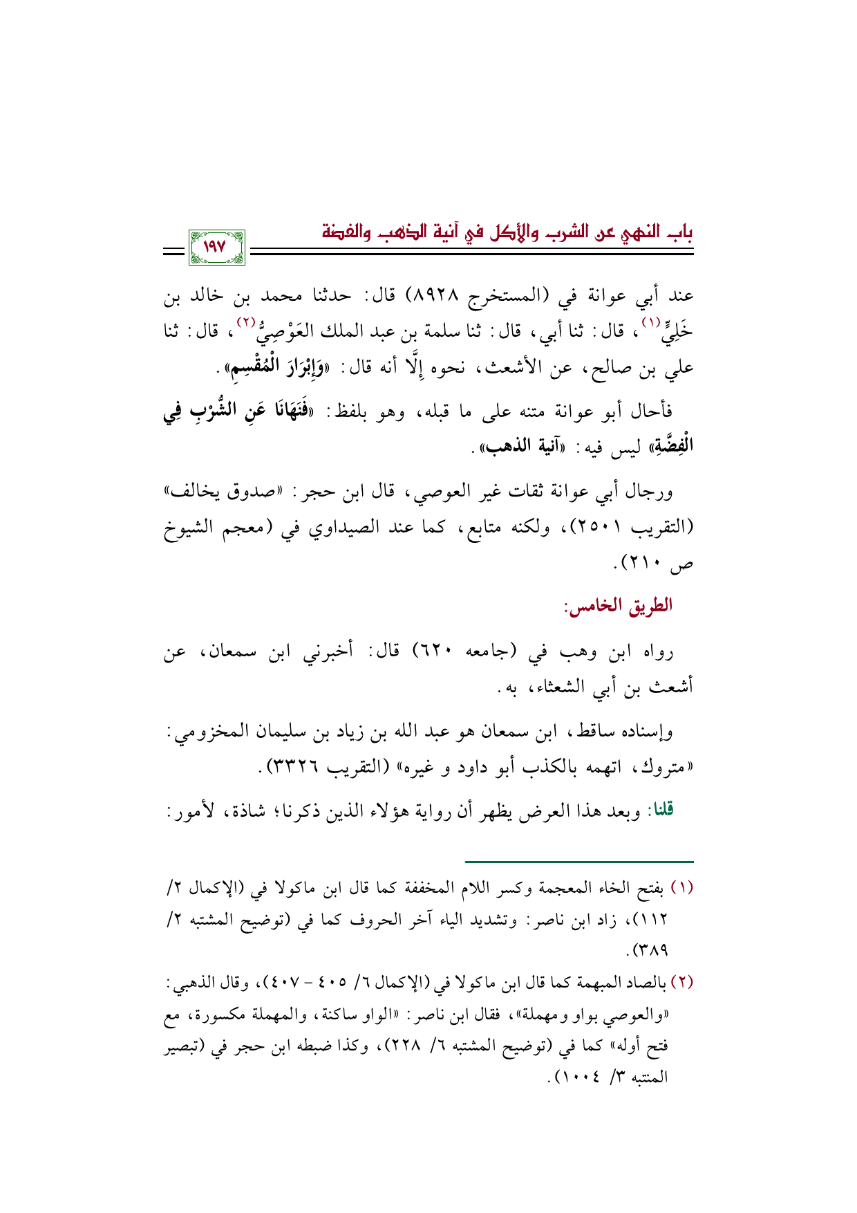 فأحال أبو عوانة متنه على ما قبله، وهو بلفظ: ((فَنَهَانَا عَنِ الشُّرْبِ فِي الْفِضَّةِ)) ليس فيه: ((آنية الذهب)).