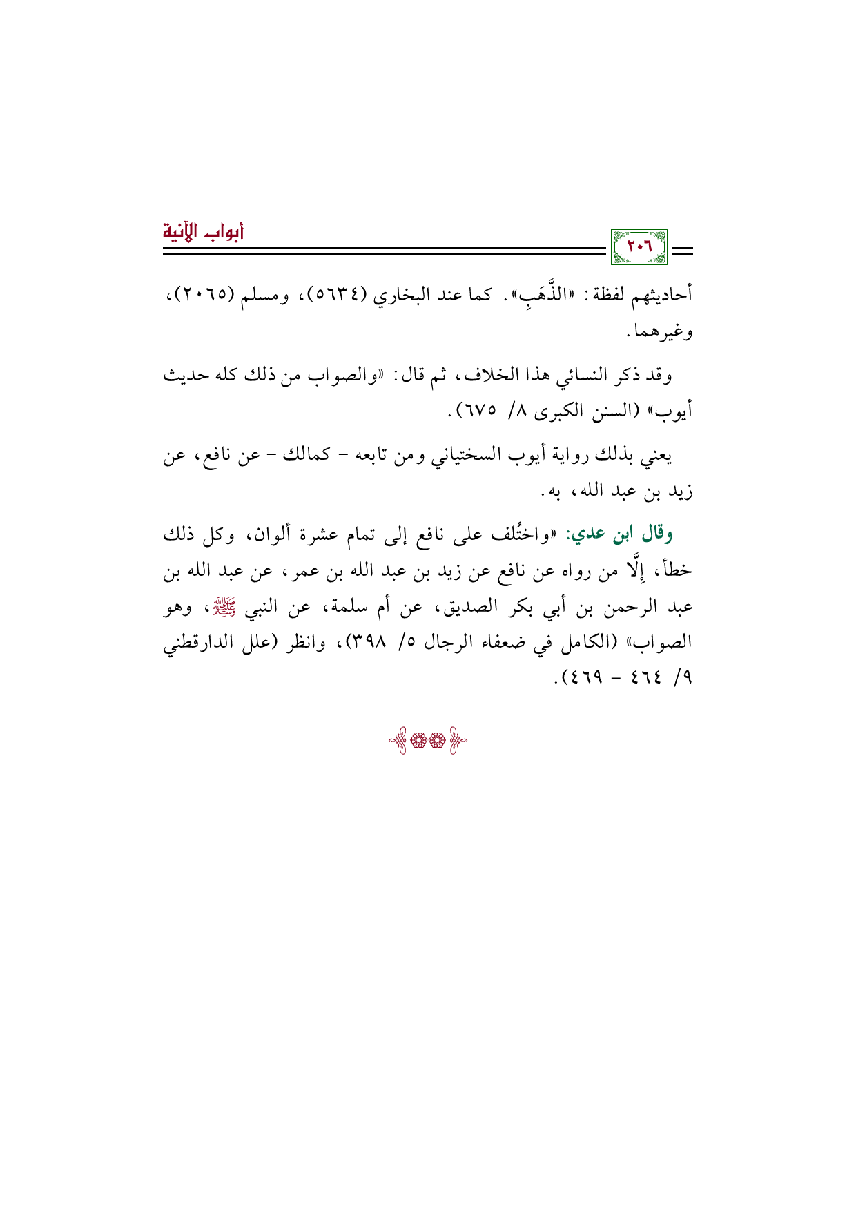 وقال ابن عدي: ((واختُلف على نافع إلى تمام عشرة ألوان، وكل ذلك خطأ، إِلَّا من رواه عن نافع عن زيد بن عبد الله بن عمر، عن عبد الله بن عبد الرحمن بن أبي بكر الصديق، عن أم سلمة، عن النبي صلى الله عليه وسلم، وهو الصواب)) (الكامل في ضعفاء الرجال ٥/ ٣٩٨)، وانظر (علل الدارقطني ٩/ ٤٦٤ - ٤٦٩).