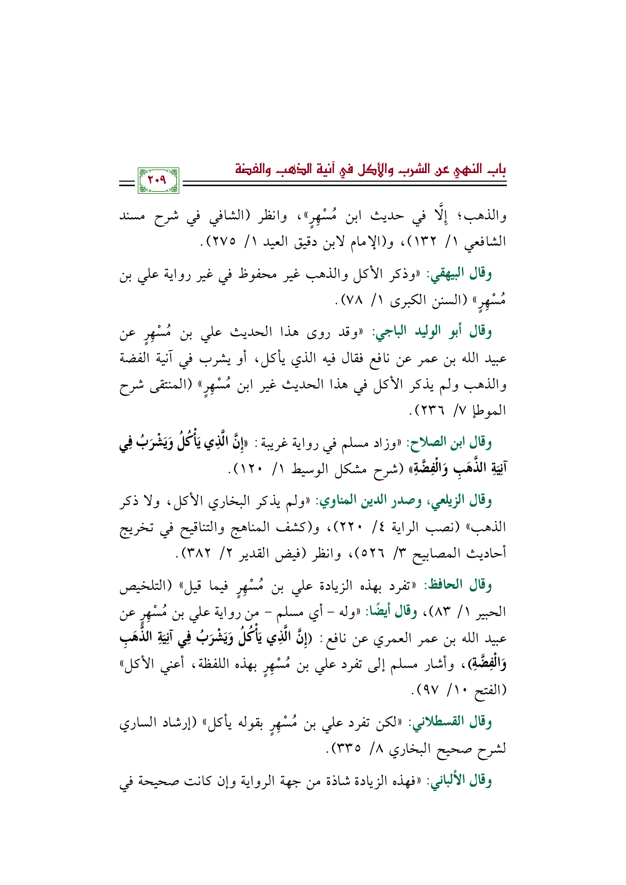 وقال الحافظ: ((تفرد بهذه الزيادة علي بن مُسْهِرٍ فيما قيل)) (التلخيص الحبير ١/ ٨٣)، وقال أيضًا: ((وله - أي مسلم - من رواية علي بن مُسْهِرٍ عن عبيد الله بن عمر العمري عن نافع: (إِنَّ الَّذِي يَأْكُلُ وَيَشْرَبُ فِي آنِيَةِ الذَّهَبِ وَالْفِضَّةِ)، وأشار مسلم إلى تفرد علي بن مُسْهِرٍ بهذه اللفظة، أعني الأكل)) (الفتح ١٠/ ٩٧).