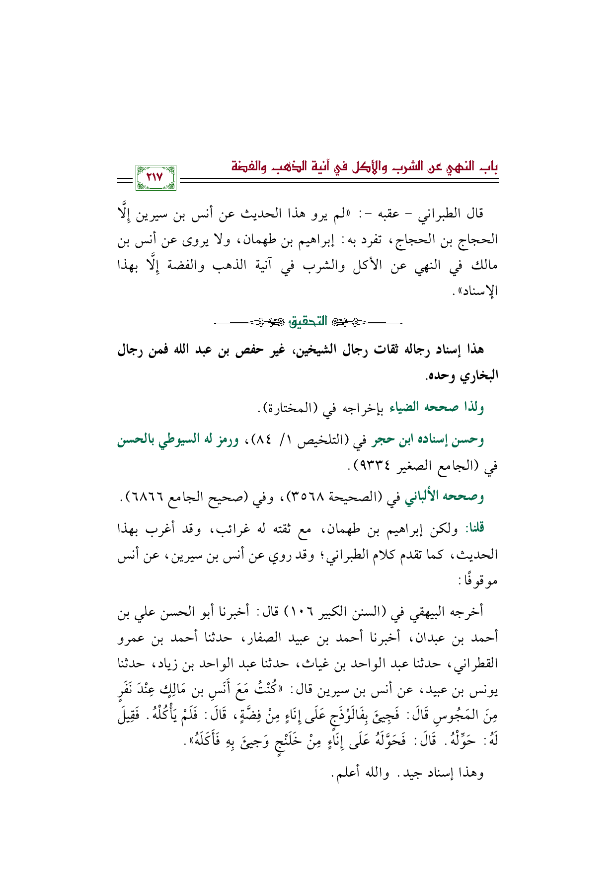 قال الطبراني - عقبه -: ((لم يرو هذا الحديث عن أنس بن سيرين إِلَّا الحجاج بن الحجاج، تفرد به: إبراهيم بن طهمان، ولا يروى عن أنس بن مالك في النهي عن الأكل والشرب في آنية الذهب والفضة إِلَّا بهذا الإسناد)).