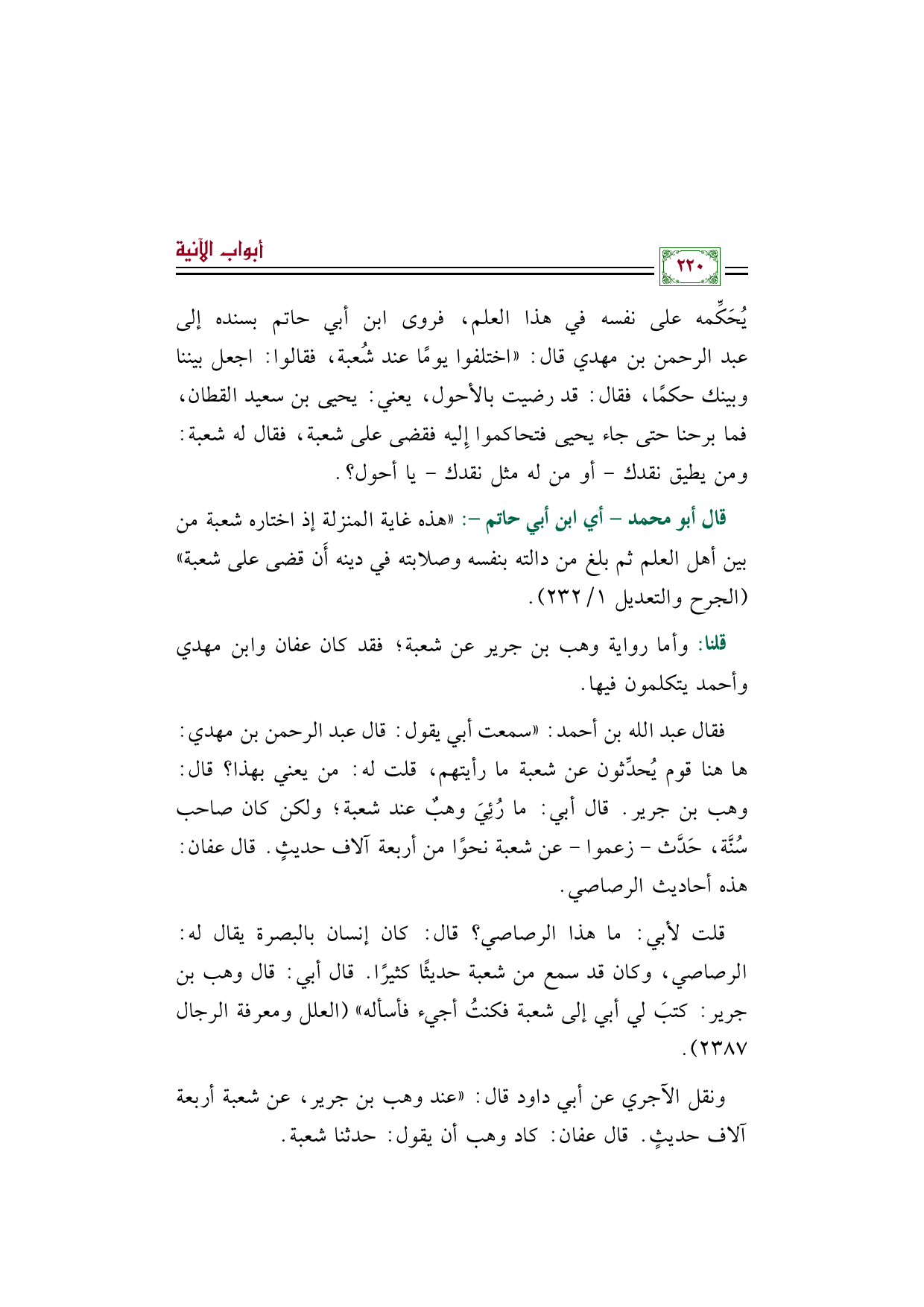قلنا: وأما رواية وهب بن جرير عن شعبة؛ فقد كان عفان وابن مهدي وأحمد يتكلمون فيها.
